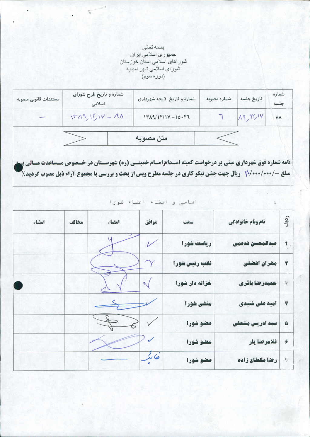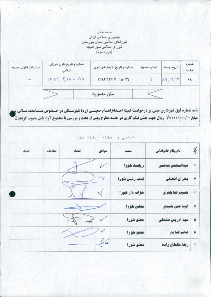 مصوبه شماره ۶ جلسه شماره ۸۸ شورای اسلامی شهر امیدیه