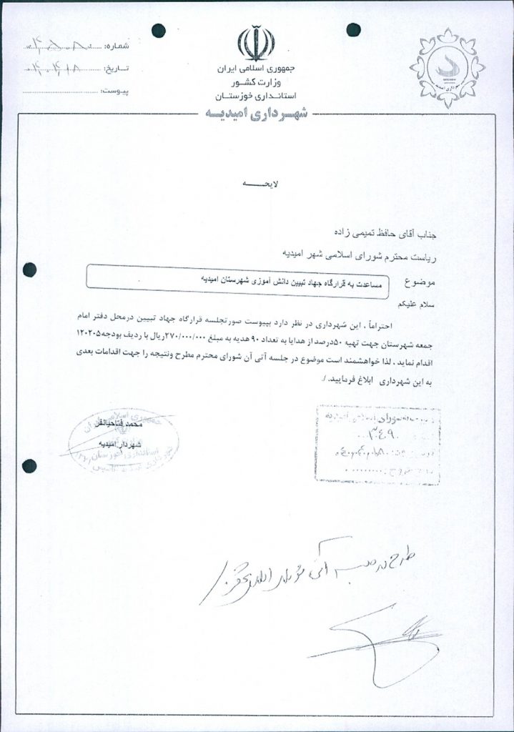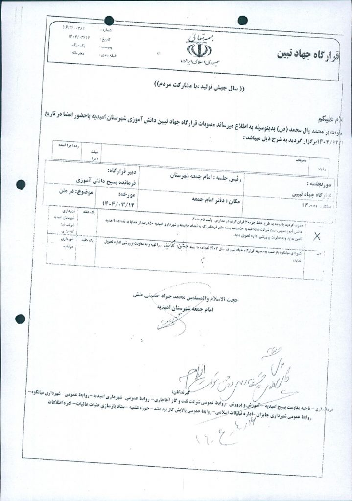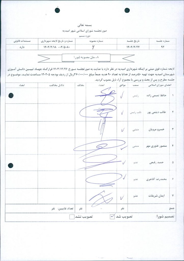 مصوبه شماره ۶ جلسه شماره ۹۲ شورای اسلامی شهر امیدیه