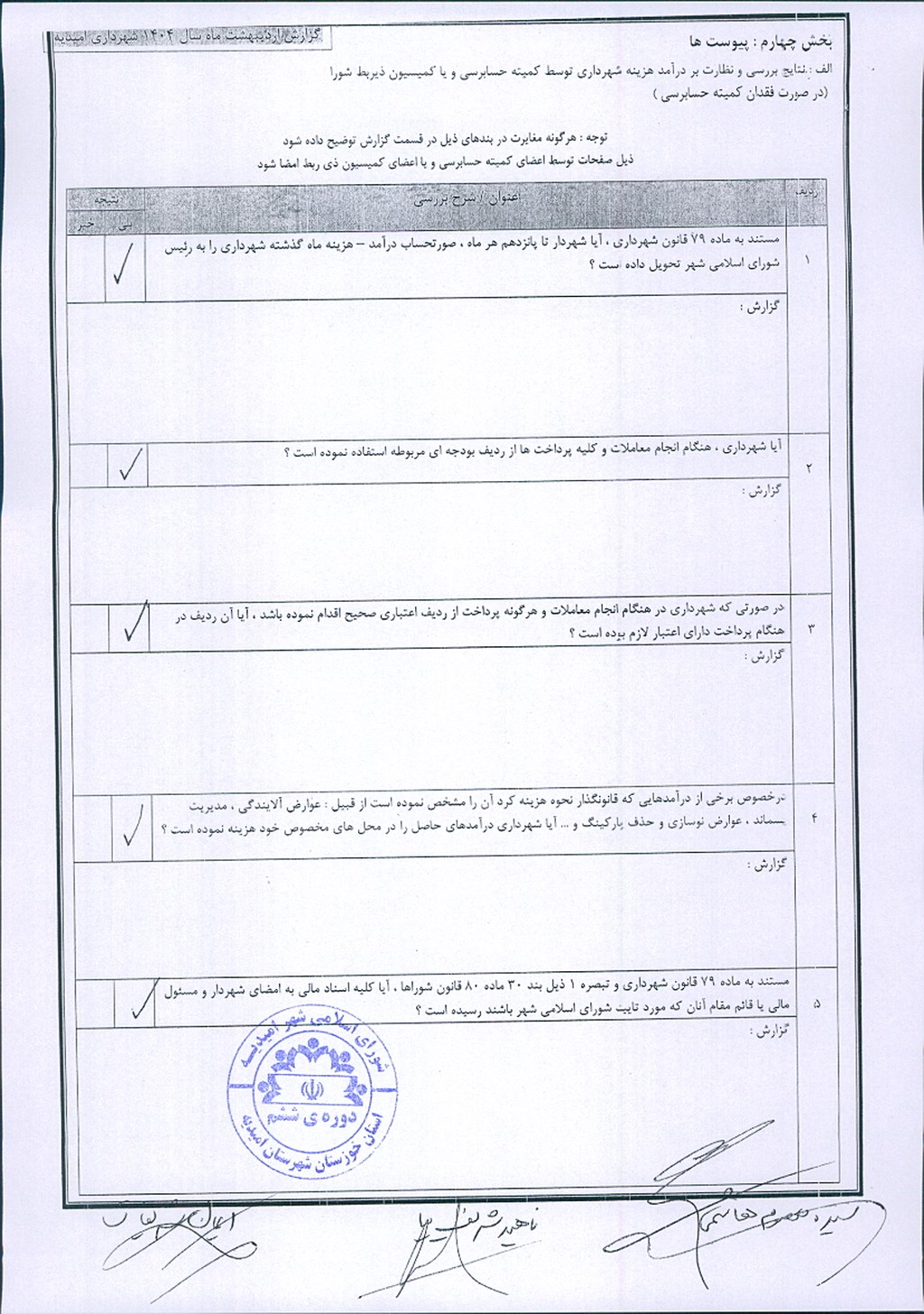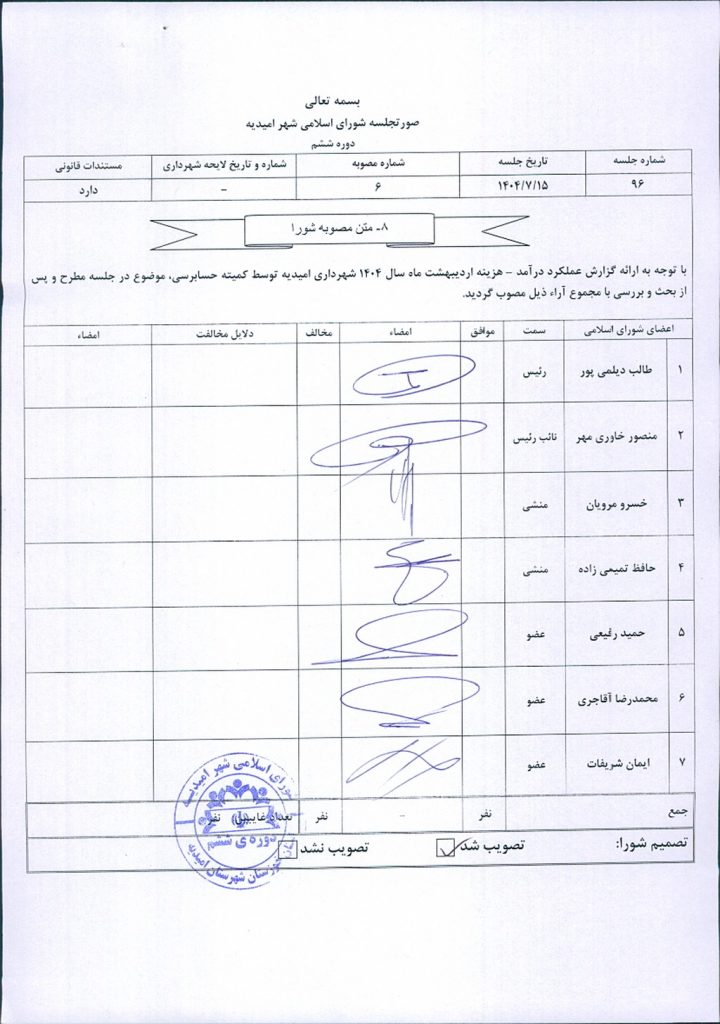 با توجه به ارائه گزارش عملکرد درآمد – هزینه اردیبهشت ماه سال ۱۴۰۴ شهرداری امیدیه توسط کمیته حسابرسی، موضوع در جلسه مطرح و پس از بحث و بررسي با مجموع آراء ذيل مصوب گرديد.