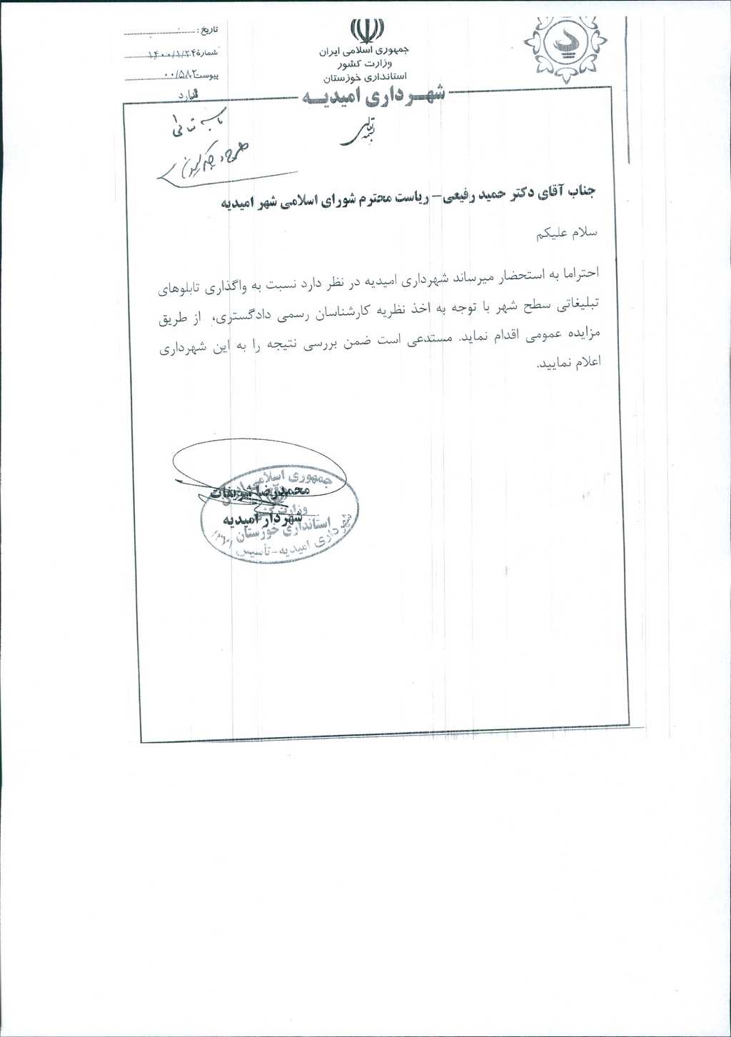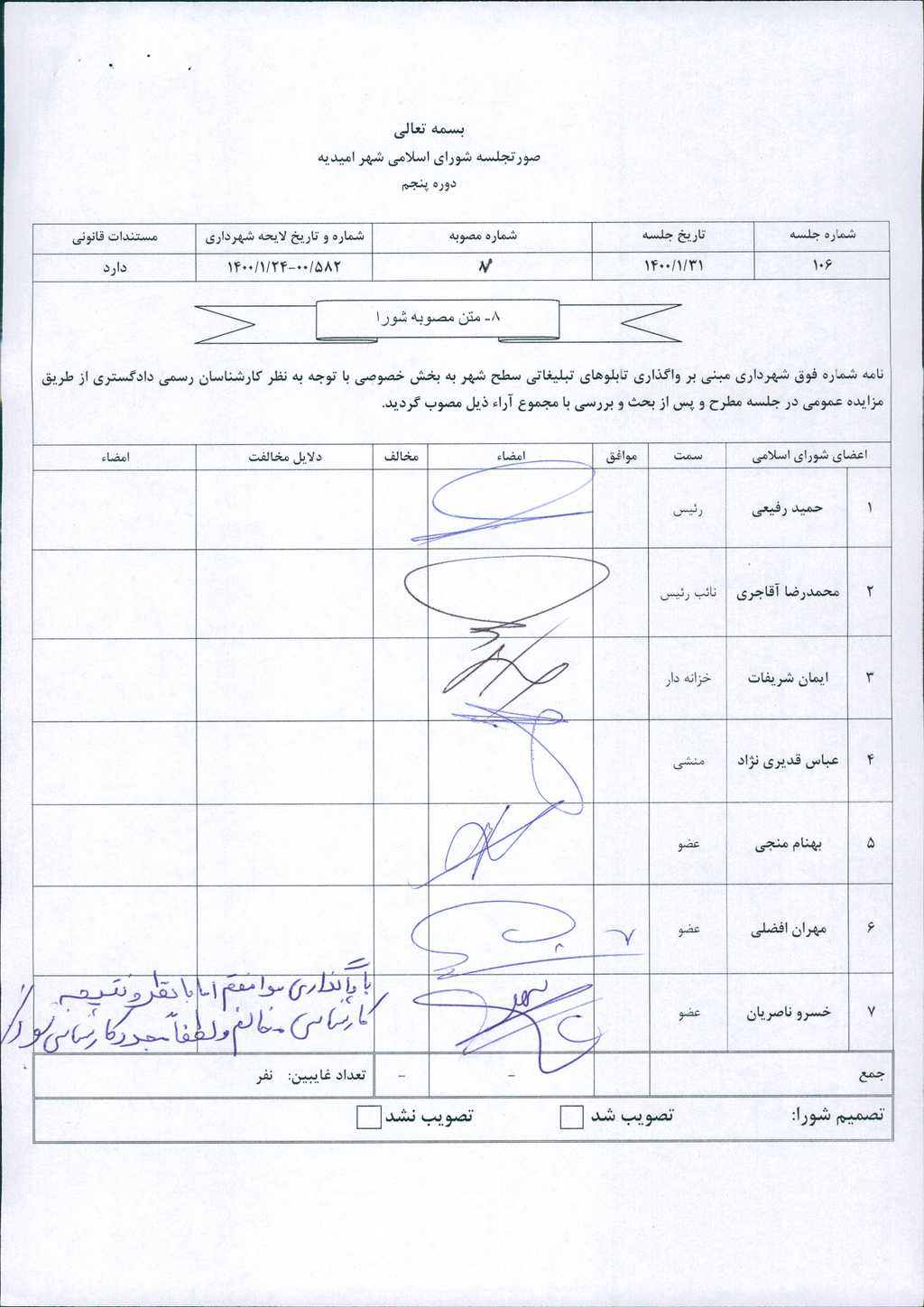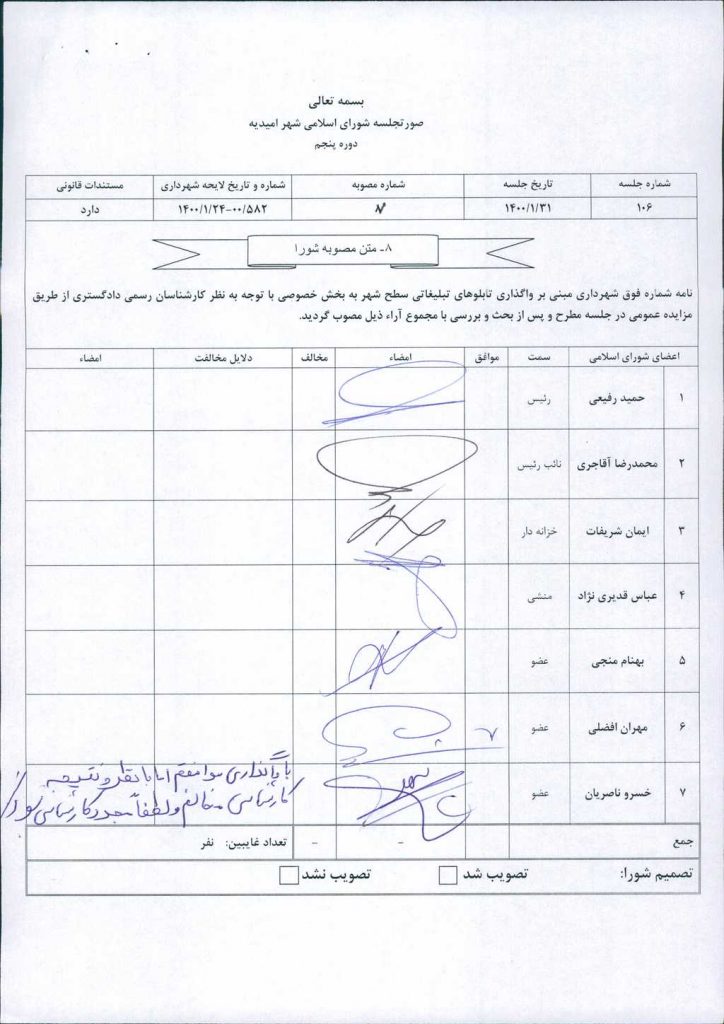 مصوبه شماره ۷ جلسه شماره ۱۰۶ شورای اسلامی شهر امیدیه