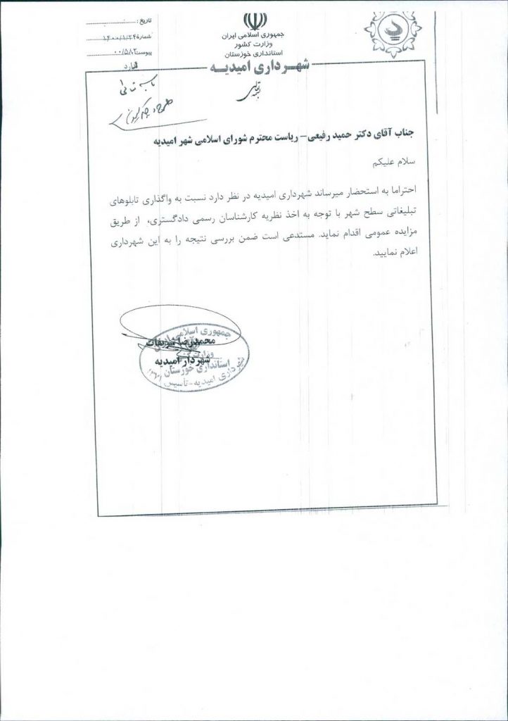 نامه شماره فوق شهرداری مبنی بر واگذاری تابلوهای تبلیغاتی سطح شهر به بخش خصوصی با توجه به نظر کارشناسان رسمی دادگستری از طریق مزایده عمومی در جلسه مطرح و پس از بحث و بررسی با مجموع آراء ذیل مصوب گردید.