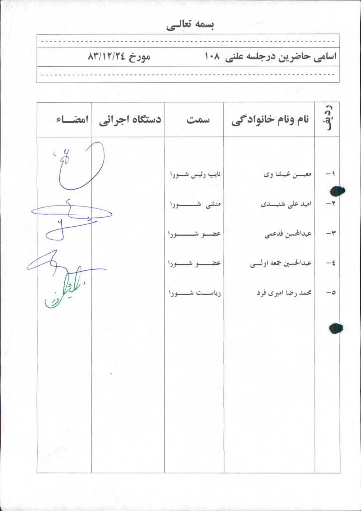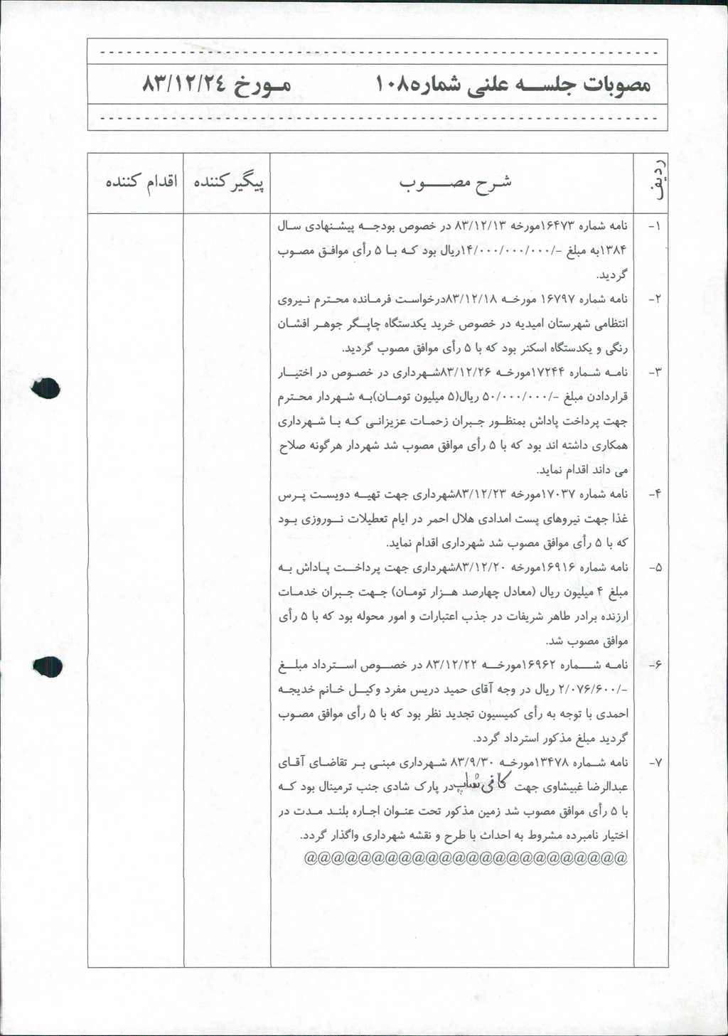 مصوبه شماره ۷ جلسه شماره ۱۰۸ شورای اسلامی شهر امیدیه