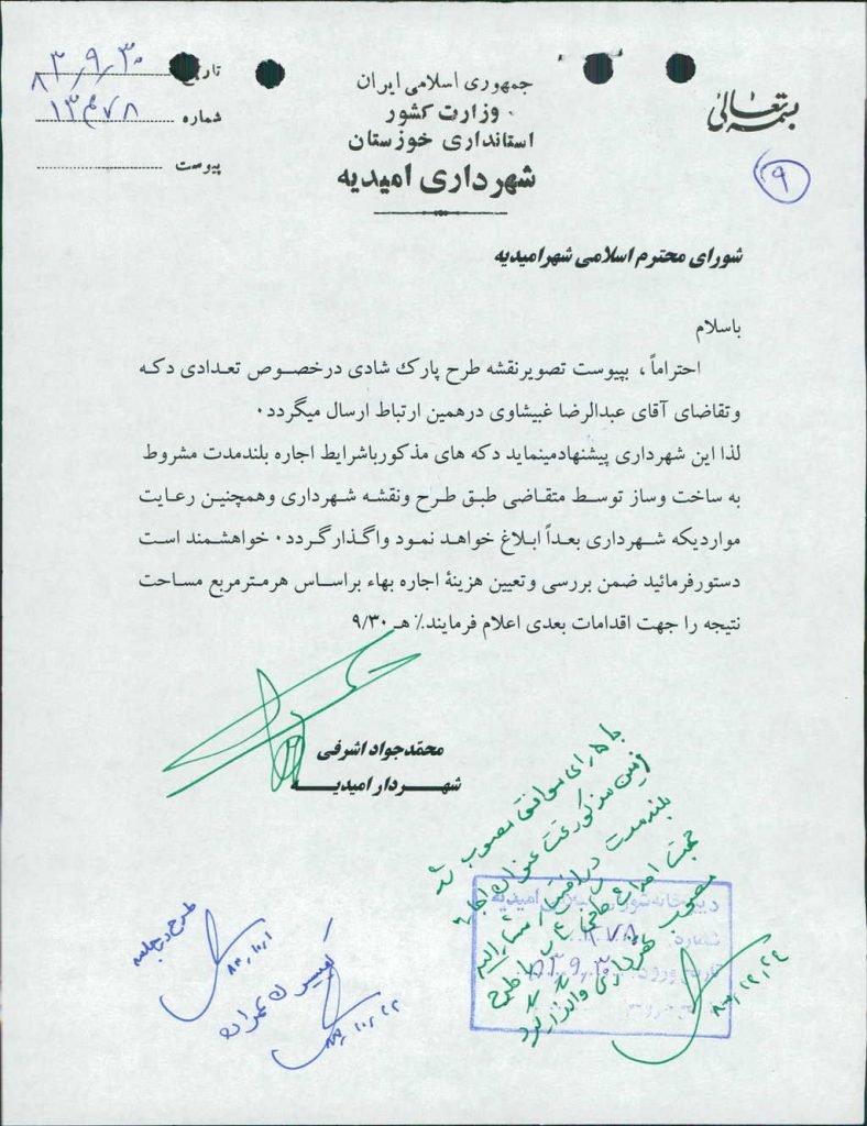 ۷-نامه شماره ۱۳۴۷۸مورخه ۳۰/ ۹/ ۸۳ شهرداري مبني بر تقاضاي آقاي عبدالرضا غبيشاوي جهت کافی شاپ در پارك شادي جنب ترمينال بود كه با ۵ رأي موافق مصوب شد زمين مذكور تحت عنوان اجاره بلند مدت در اختيار نامبرده مشروط به احداث با طرح و نقشه شهرداري واگذار گردد.