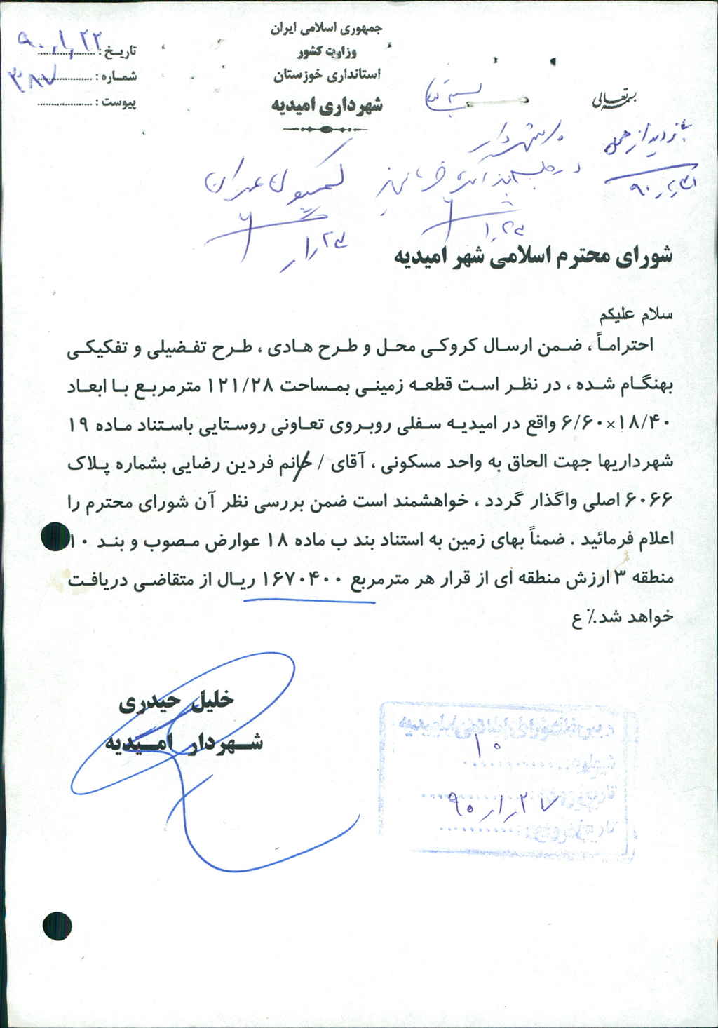 نامه شماره فوق شهرداری در خصوص طرح تفضیلی و الحاق قطعه زمینی به مساحت۲۸/ ۱۲۱مترمربع با ابعاد پیوستی واقع در امیدیه سفلی روبروی تعاونی روستایی باستناد ماده ۱۹ شهرداریها جهت الحاق به واحد مسکونی آقای فردین رضایی بشماره پلاک ۶۰۶۶( با اخذ بهای زمین به استناد بند ب ماده ۱۸ عوارض مصوب و بند ۱۰ منطقه ۳ ارزش منطقه ای از قرار هر متر مربع -/۴۰۰/ ۶۷۰/ ۱ريال)که پس از بحث و بررسی با مجموع آراء ذیل مصوب گردید%