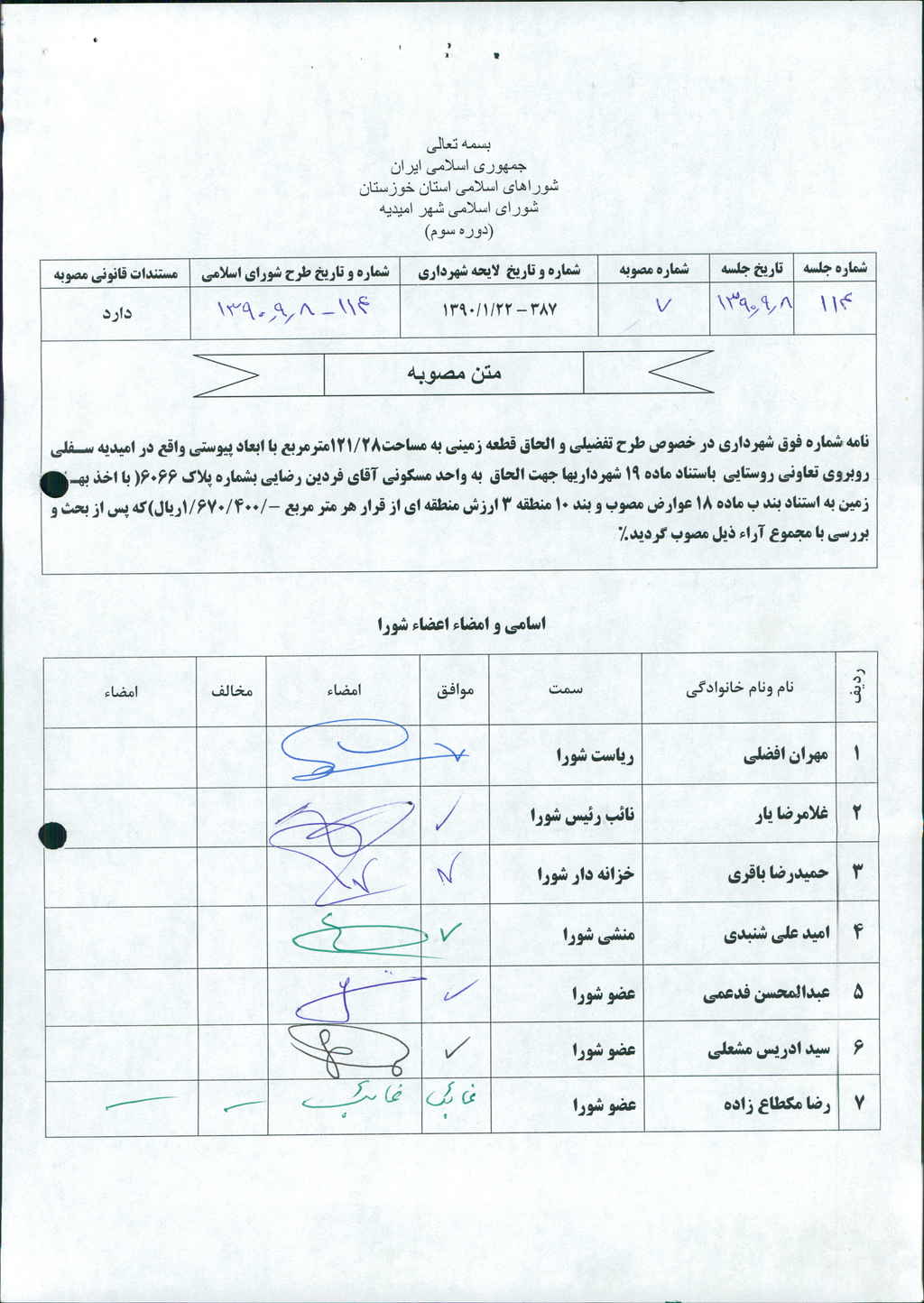 مصوبه شماره ۷ جلسه شماره ۱۱۴ شورای اسلامی شهر امیدیه