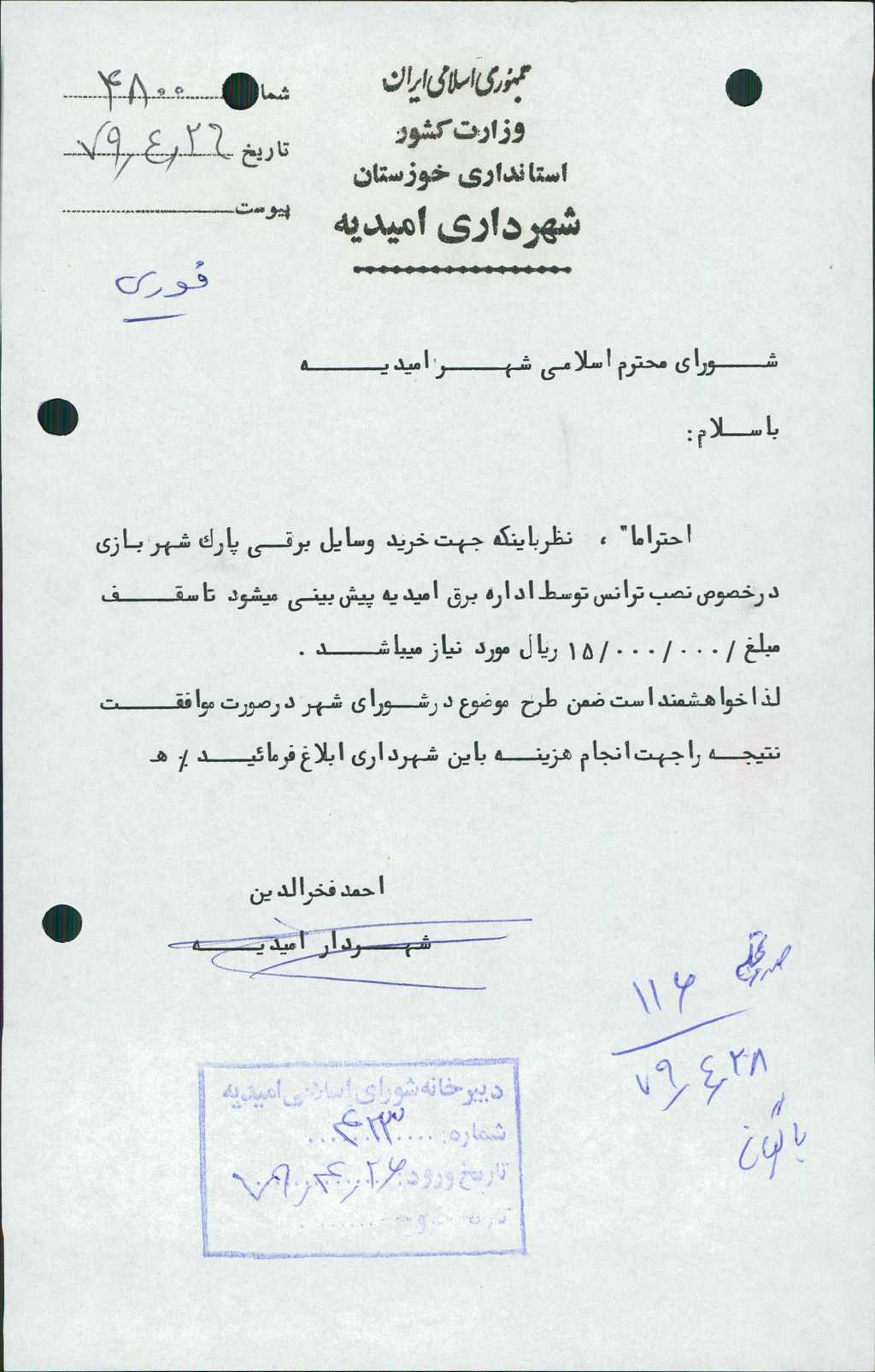 ۷-نامه شماره ۴۸۰۰ مورخ ۲۶/ ۴/ ۷۹ شهرداري در رابطه با خريد وسايل برقي پارك شهربازي در خصوص نصب ترانس توسط اداره برق اميديه كه پيش بيني تا سقف -/۰۰۰/۰۰۰/ ۱۵ ريال ميباشد مطرح و با تعداد ۷ رأي موافق مقرر گرديد شهرداري اقدام لازم را بعمل آورند.