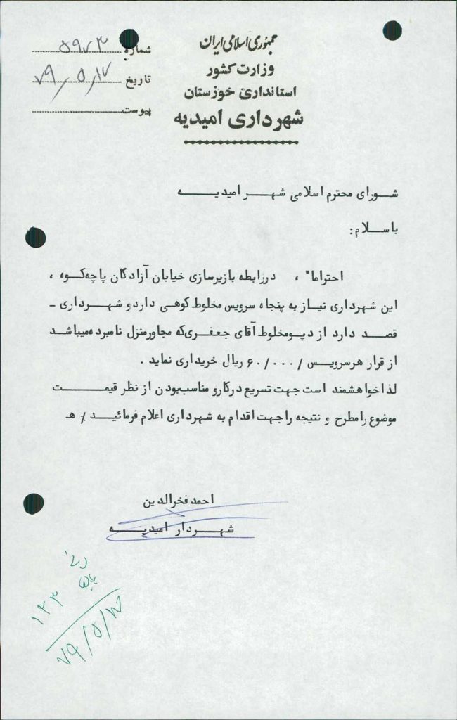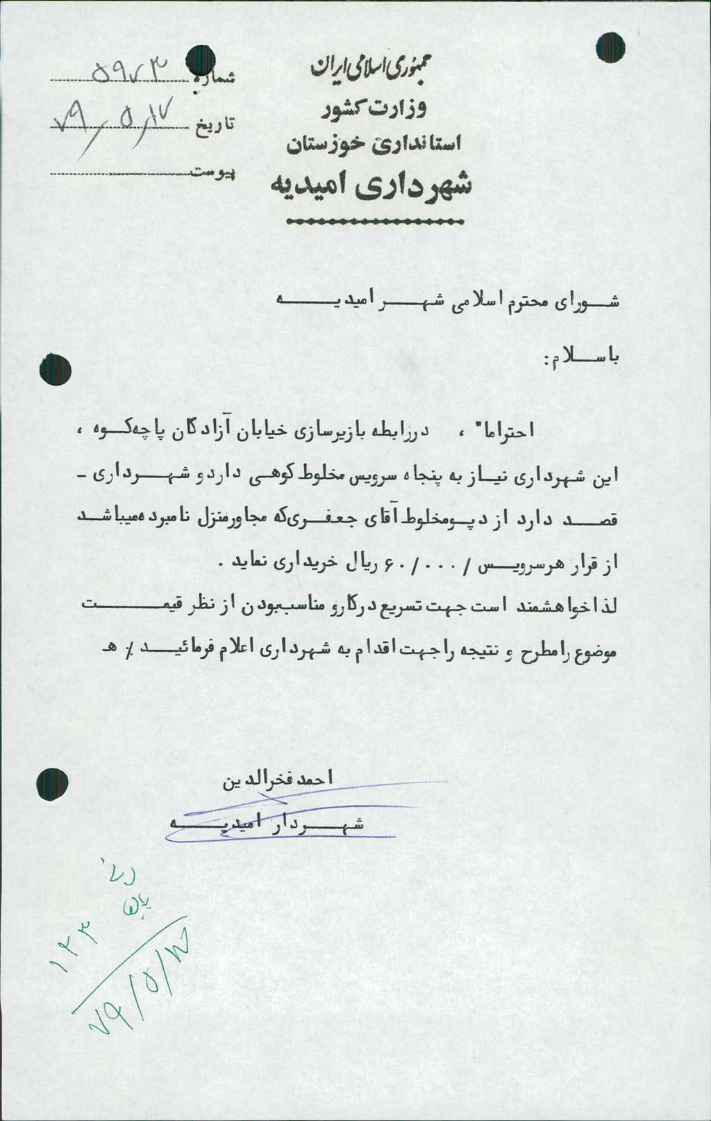 مصوبه شماره ۷ جلسه شماره ۱۲۳ مورخ ۷۹/۵/۱۷ شورای اسلامی شهر امیدیه