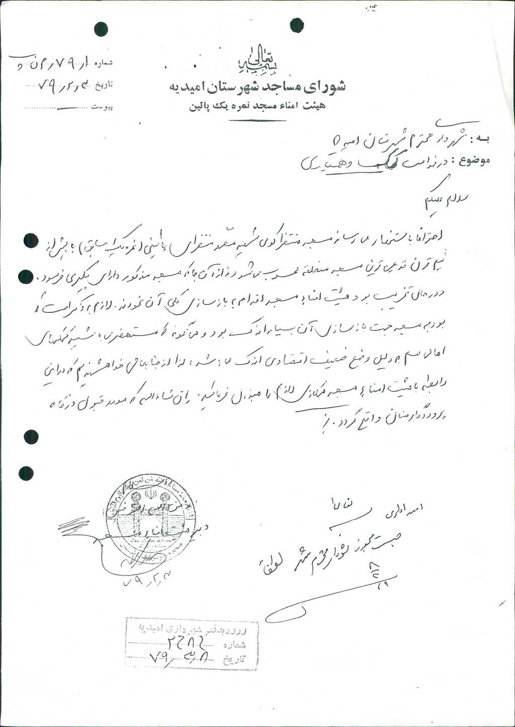 ۷-نامه شماره ۳۶۱۷ مورخه ۱/ ۴/ ۷۹ شهرداري در رابطه با درخواست هيئت امناء مسجد نمره يك پائين در خصوص كمك و همياري مطرح و با تعداد ۵ رأي موافق مقرر گرديد تعداد ۱۰ كيسه سيمان و سه سرويس ماسه جهت ساخت مسجد از سوي شهرداري كمك نمايند.