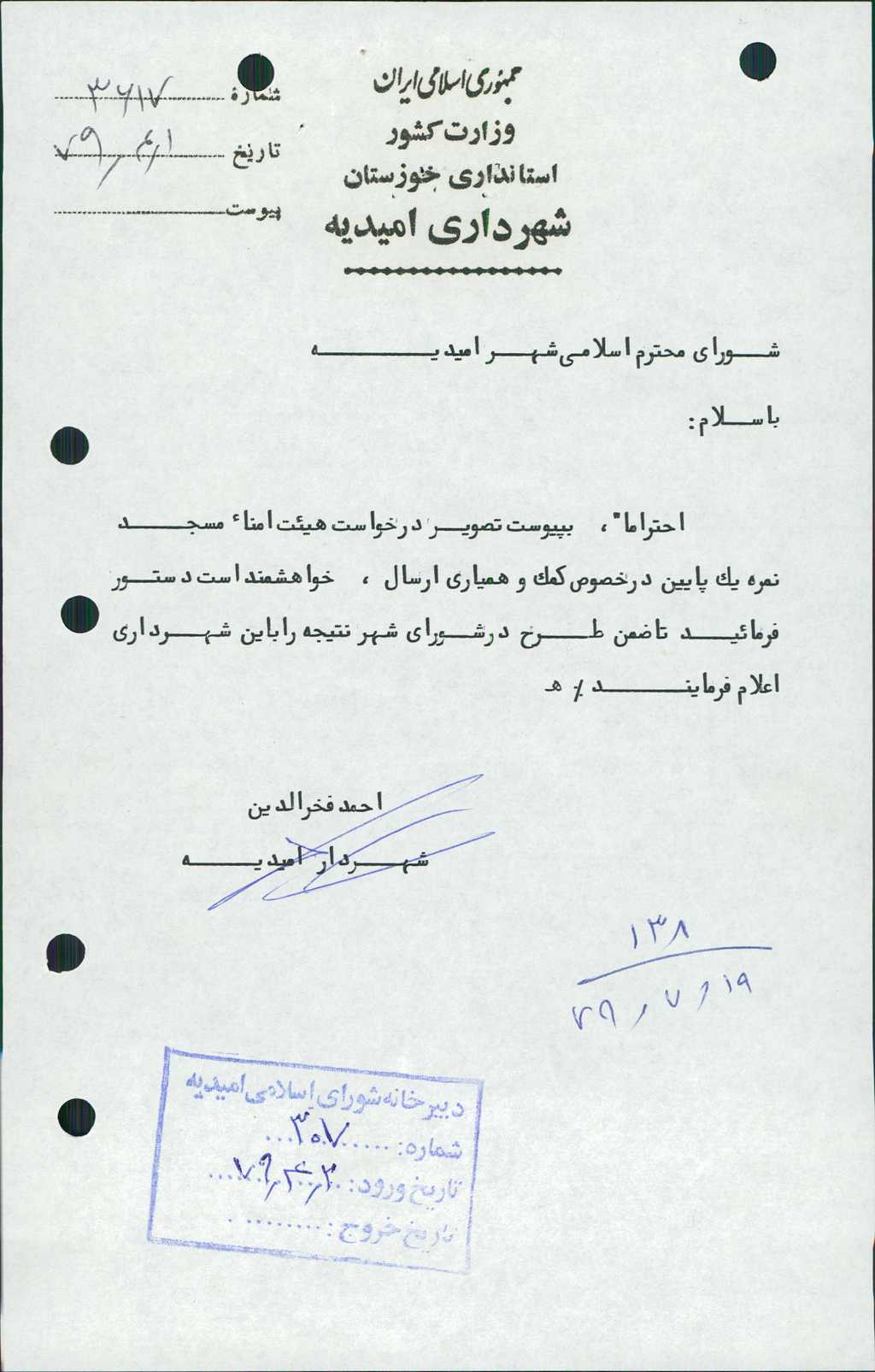 مصوبه شماره ۷ جلسه شماره ۱۳۸ مورخ ۷۹/۷/۱۹ شورای اسلامی شهر امیدیه