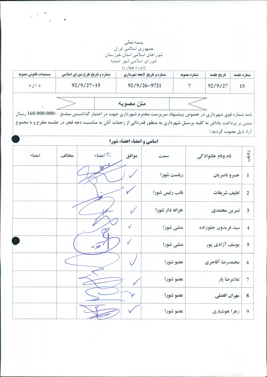 مصوبه شماره ۷ جلسه شماره ۱۵ شورای اسلامی شهر امیدیه