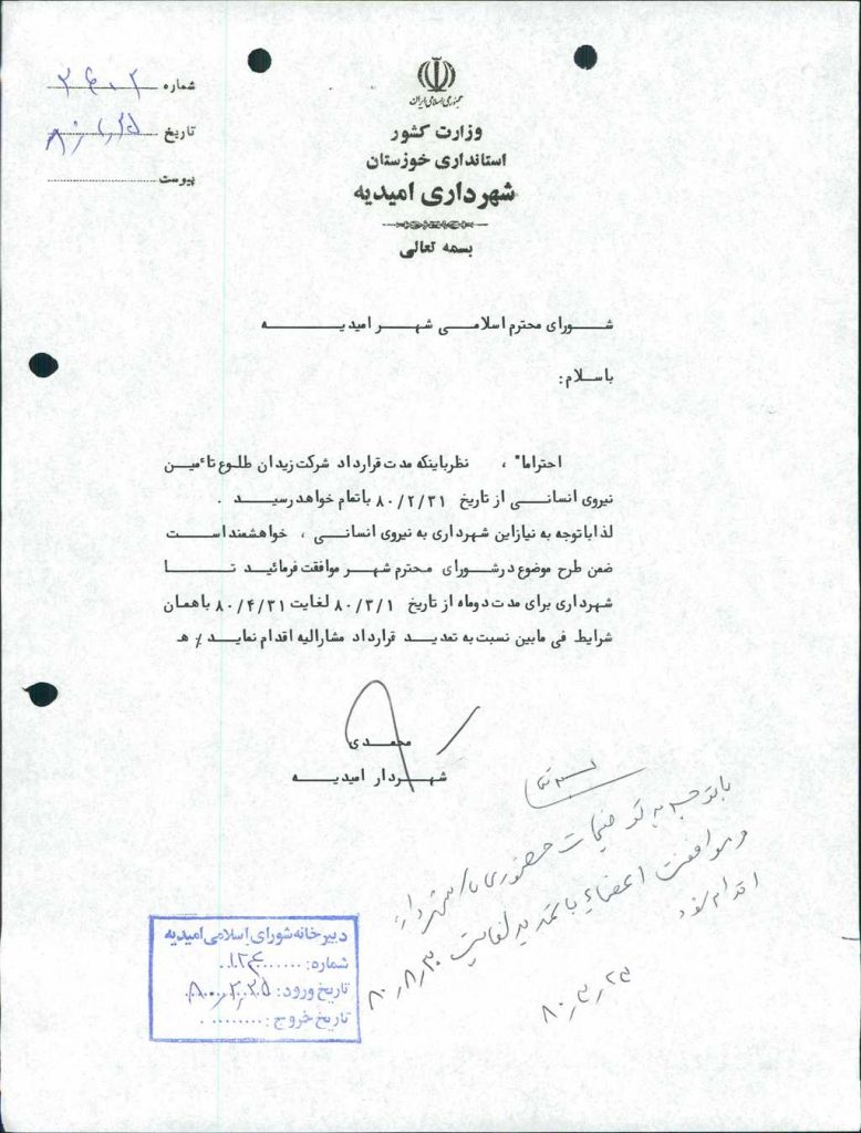 ۷-نامه شماره ۲۴۰۲-۲۵/ ۲/ ۸۰شهرداری مبنی بر تمدید قرارداد شرکت زیدان طلوع به مدت دو ماه از تاریخ ۱/ ۳/ ۸۰ لغایت ۳۱/ ۴ /۸۰ قرائت گردید که با توجه به توضیحات حضوری شهردار محترم و موافقت اعضاء با تمدید لغایت ۳۰/ ۸/ ۸۰اقدام گردد که با ۶ رأی موافق بتصویب رسید.