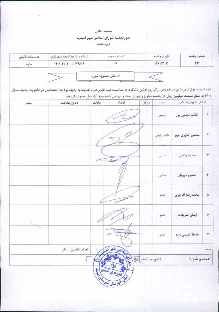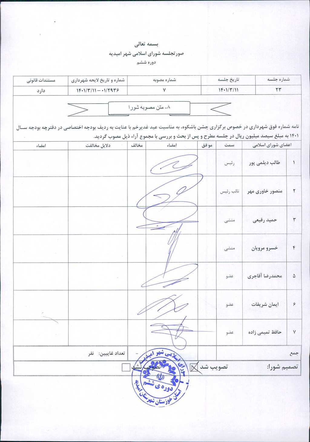 مصوبه شماره ۷ جلسه شماره ۲۳ شورای اسلامی شهر امیدیه