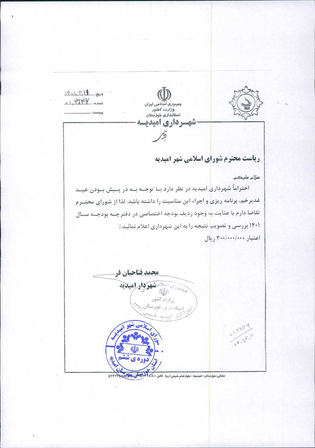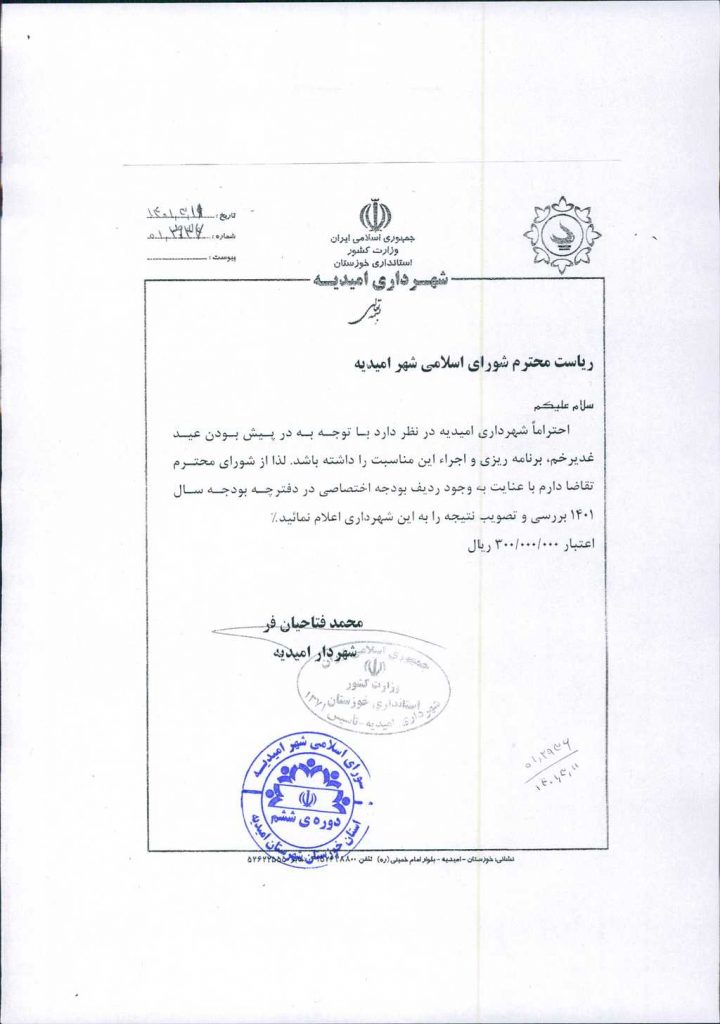 نامه شماره فوق شهرداری در خصوص برگزاری جشن باشکوه، به مناسبت عید غدیرخم با عنایت به ردیف بودجه اختصاصی در دفترچه بودجه سال ۱۴۰۱ به مبلغ سیصد میلیون ریال در جلسه مطرح و پس از بحث و بررسی با مجموع آراء ذیل مصوب گردید.