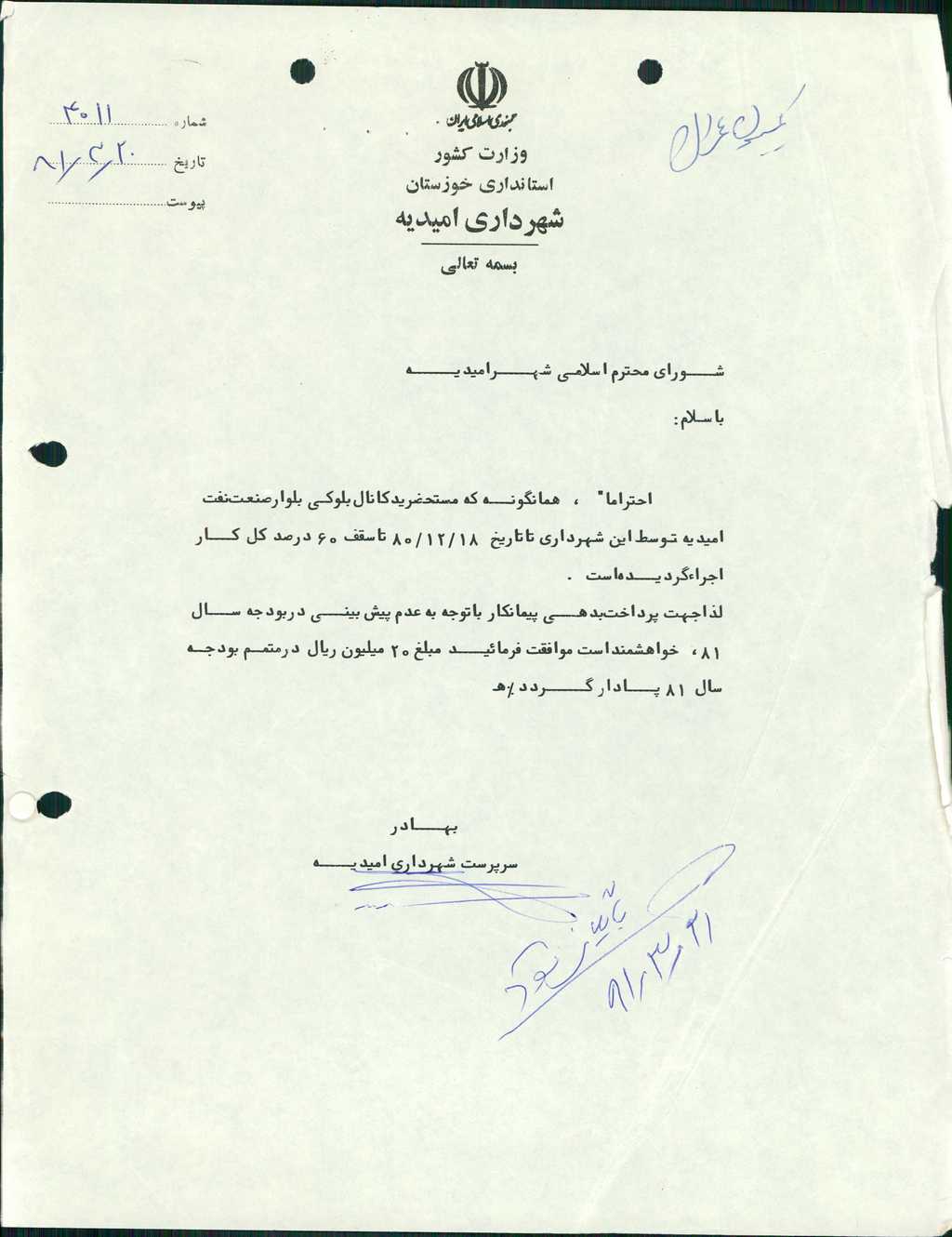 ۷-نامه شماره ۴۰۱۱ مورخه۲۰/ ۳/ ۸۱ شهرداري با عنايت به پيشرفت ۶۰% كل كار مربوط به كانال بلوكي  بلوار صنعت نفت اميديـه توسط شهرداري تا تاريخ ۱۸/ ۱۲/ ۸۰ ،لذا مبلغ ۲۰ ميليـون ريال(دو ميليون تومان)در متمـم بودجـه سال ۸۱جهـت پرداخـت بدهي پيمانـكار مقرر گرديدكه پس از بحث وبررسـي بـا ۶رأي موافق به تصويب رسيـد.