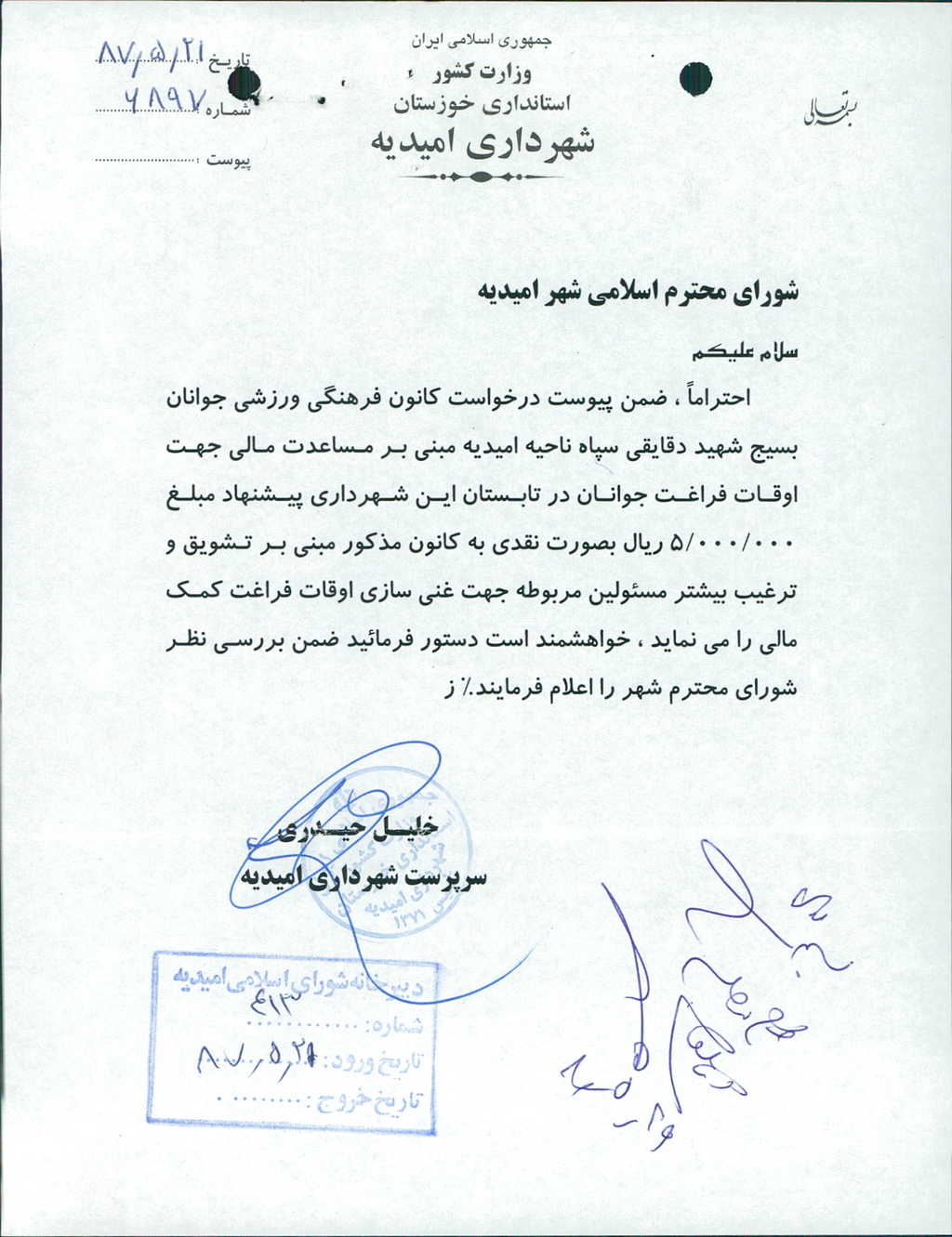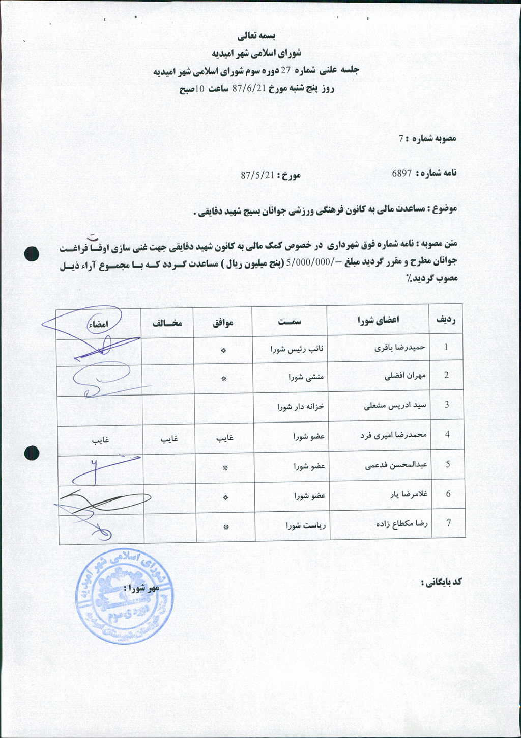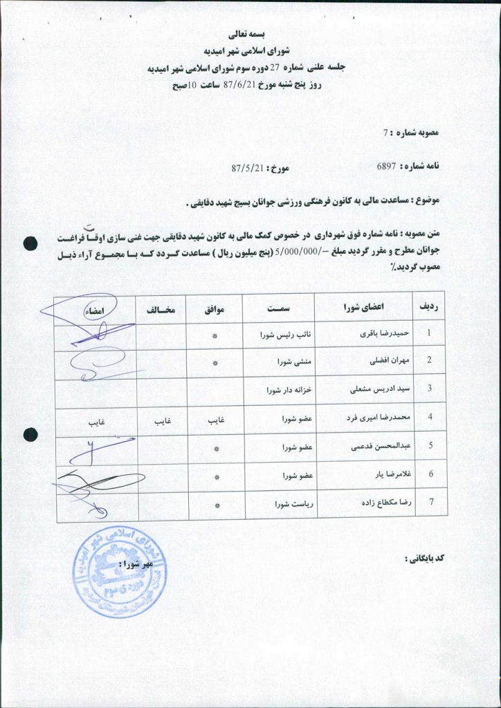 مصوبه شماره ۷ جلسه شماره ۲۷ شورای اسلامی شهر امیدیه