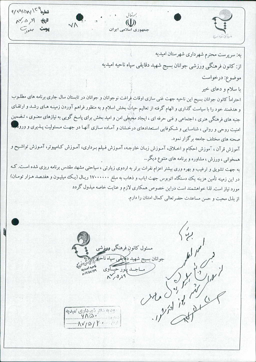 موضوع : مساعدت مالی به کانون فرهنگی ورزشی جوانان بسیج شهید دقایقی .