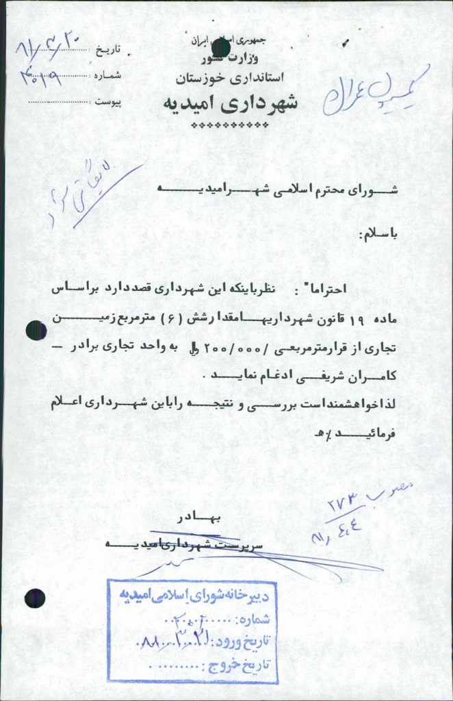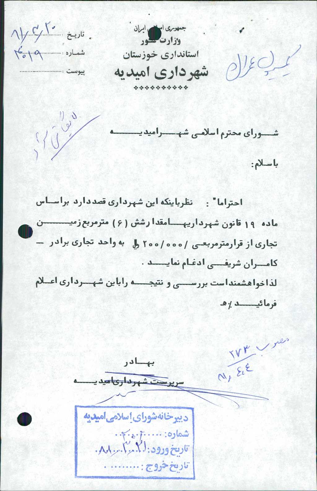 بسم الله الرحمن الرحیم مصوبه شماره ۷ جلسه شماره ۲۷۳ شورای اسلامی شهر امیدیه