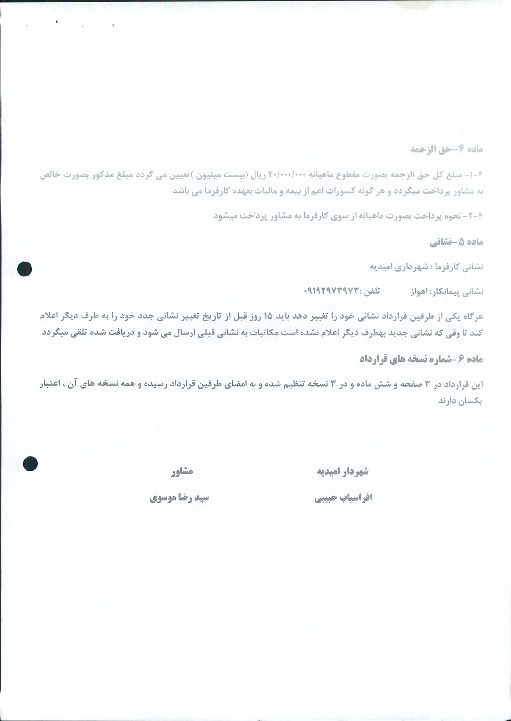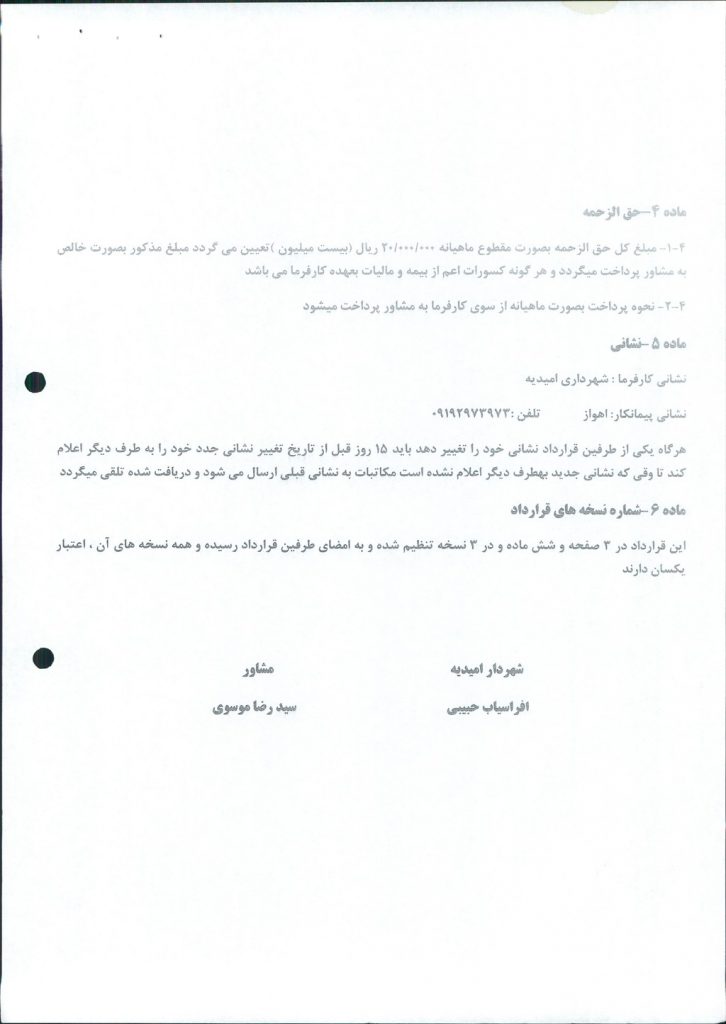نامه شماره فوق شهرداری درخصوص بکارگیری آقای سید رضا موسوی بعنوان مشاور فنی در امور مبلمان شهری با دستمزد ماهیانه بیست میلیون ریال بصورت پاره وقت با قرارداد شش ماهه با شرح کار مشخص و درصورت رضایت شهردار از عملکرد ایشان قابل تمدید به یکسال در جلسه مطرح و پس از بحث و بررسی با مجموع آراء ذیل مصوب گردید%