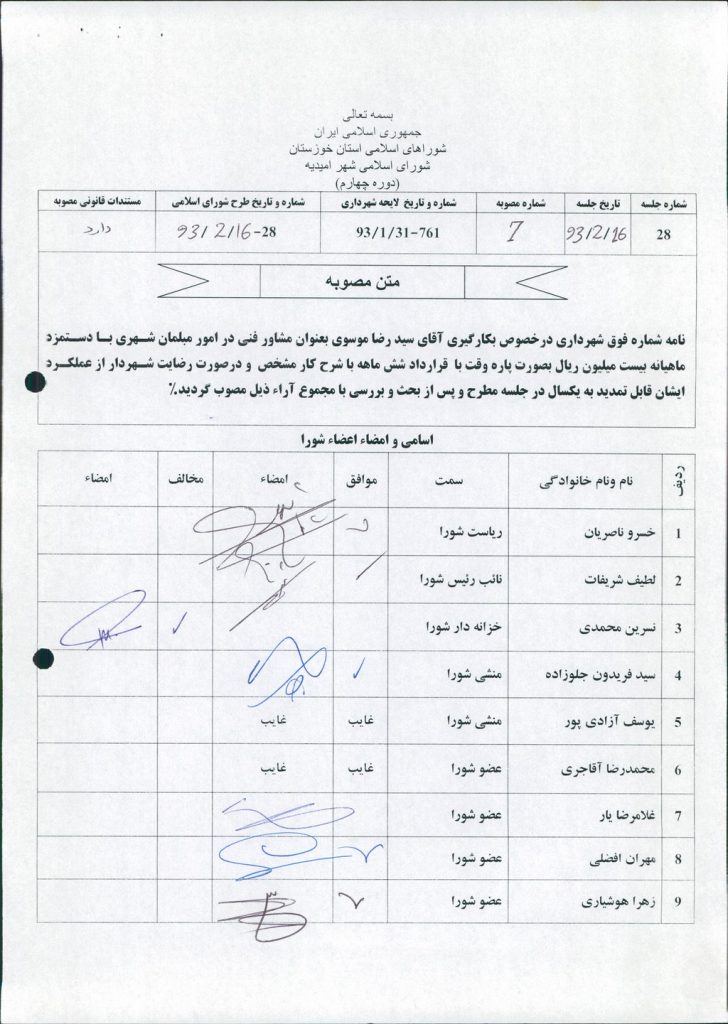 مصوبه شماره ۷ جلسه شماره ۲۸ شورای اسلامی شهر امیدیه