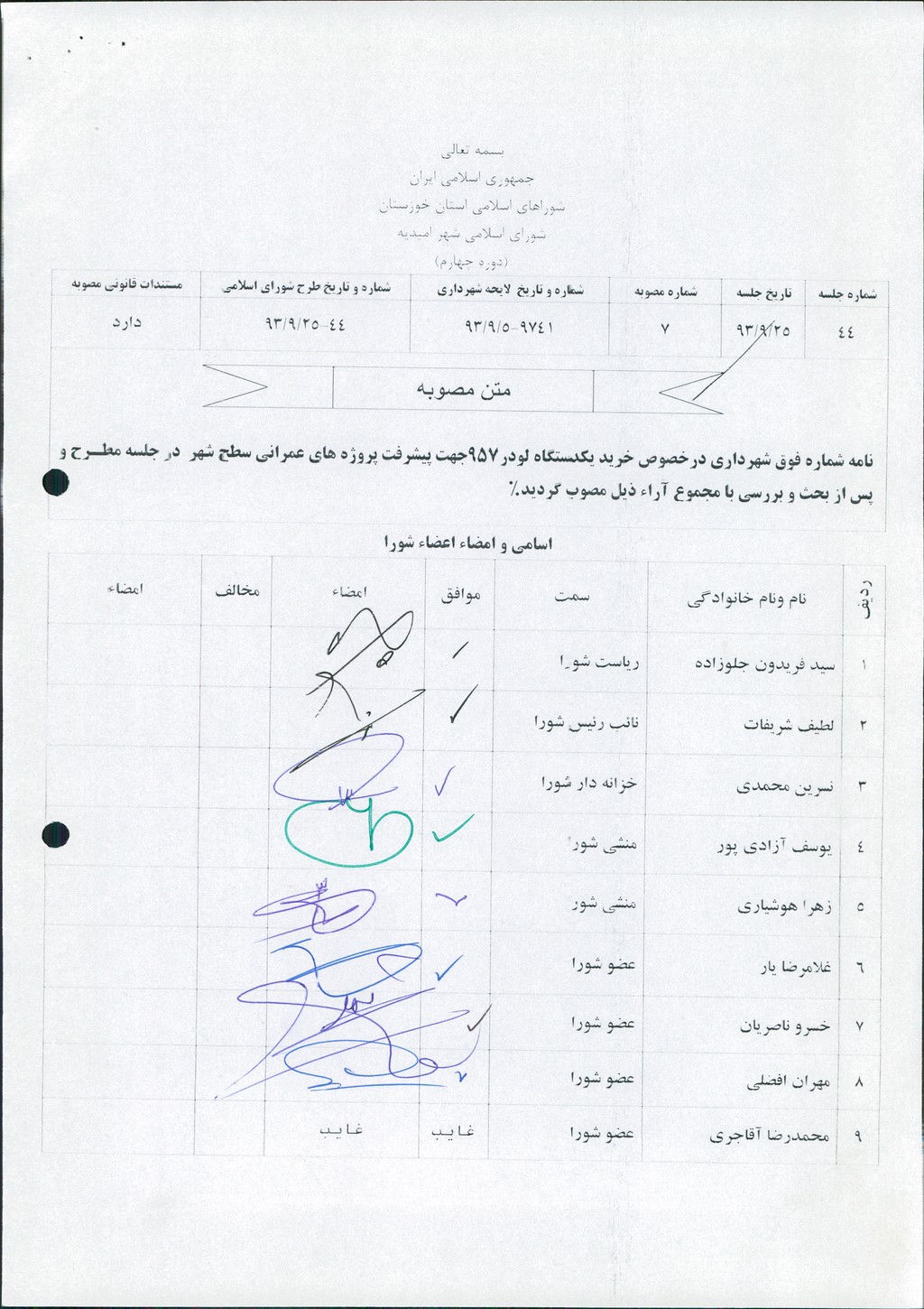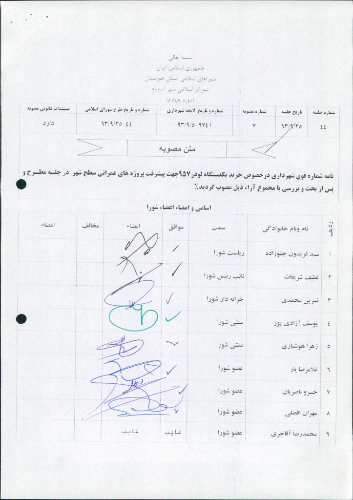 مصوبه شماره ۷ جلسه شماره ۴۴ مورخ ۹۳/۹/۲۵ شورای اسلامی شهر امیدیه