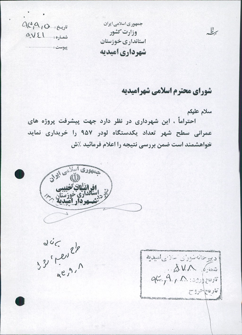 نامه شماره فوق شهرداری درخصوص خرید یکدستگاه لودر۹۵۷جهت پیشرفت پروژه های عمرانی سطح شهردر جلسه مطرح و پس از بحث و بررسی با مجموع آراء ذیل مصوب گردید%