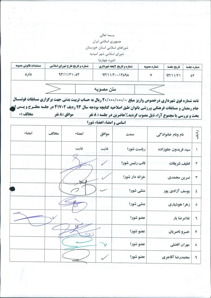 مصوبه شماره ۷ جلسه شماره ۵۲ شورای اسلامی شهر امیدیه