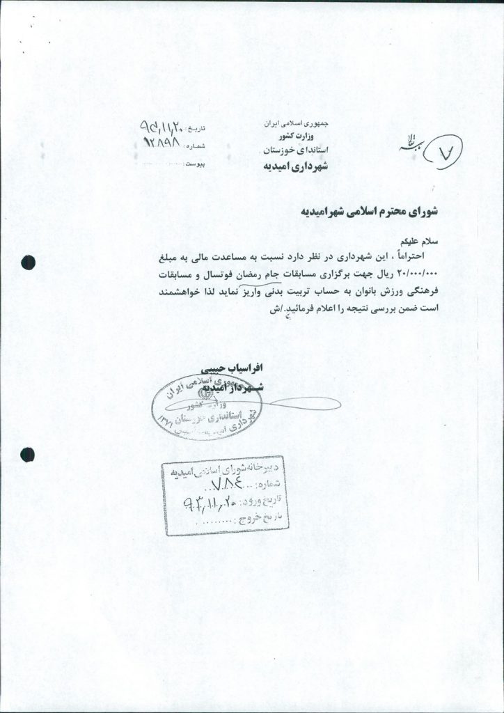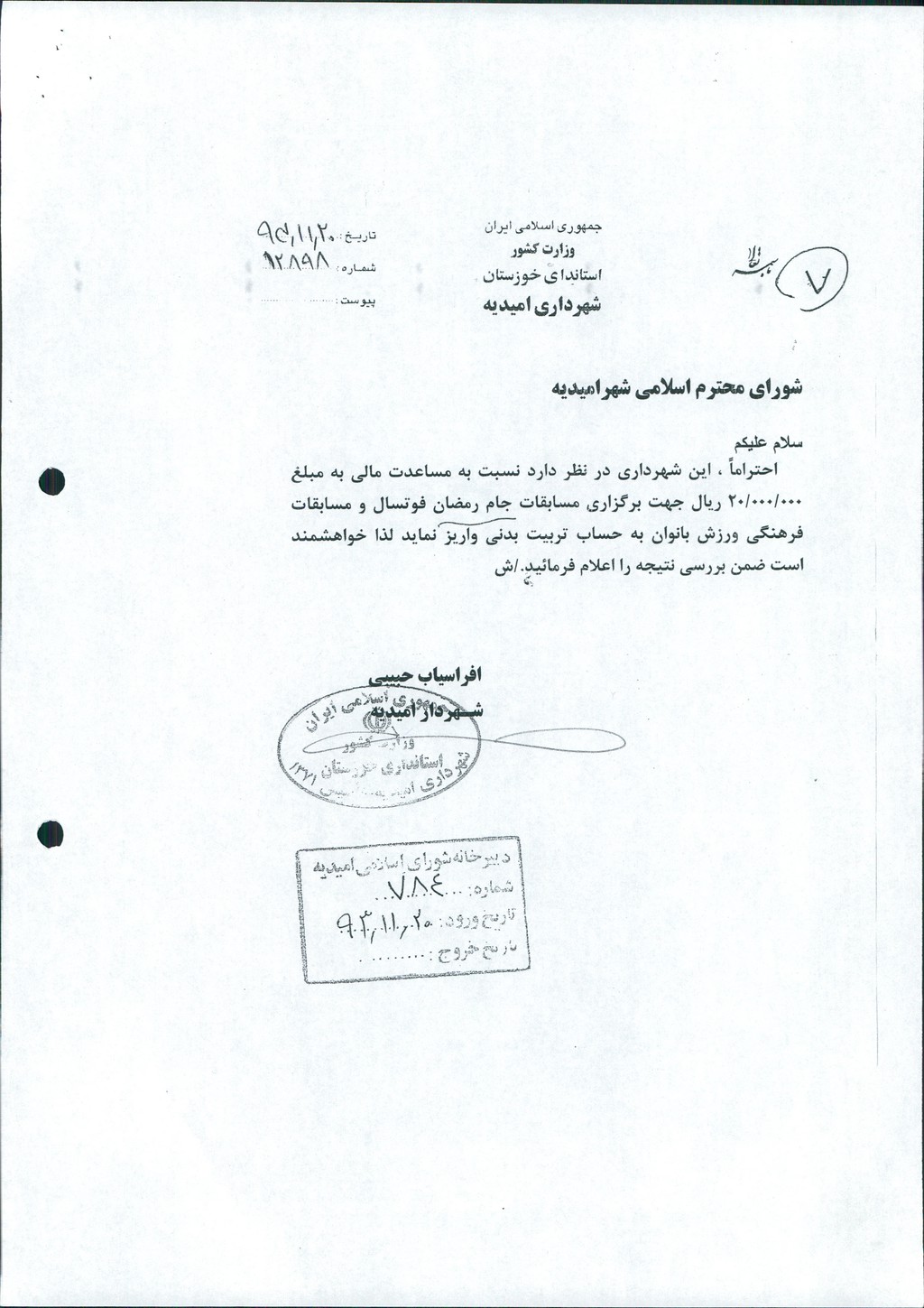 نامه شماره فوق شهرداری درخصوص واریز مبلغ ۲۰۰۰۰۰۰۰ ریال به حساب تربیت بدنی جهت برگزاری مسابقات فوتسال جام رمضان و مسابقات فرهنگی ورزشی بانوان طبق اصلاحیه کتابچه بودجه سال ۹۳ ردیف ۴۱۷۰۲ در جلسه مطرح و پس از بحث و بررسی با مجموع آراء ذیل مصوب گردید%