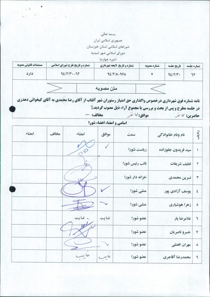 نامه شماره فوق شهرداری درخصوص واگذاری حق امتیاز رستوران شهر آفتاب از آقای رضا محمدی به آقای کیخوائی دهدزی در جلسه مطرح و پس از بحث و بررسی با مجموع آراء ذیل مصوب گردید%