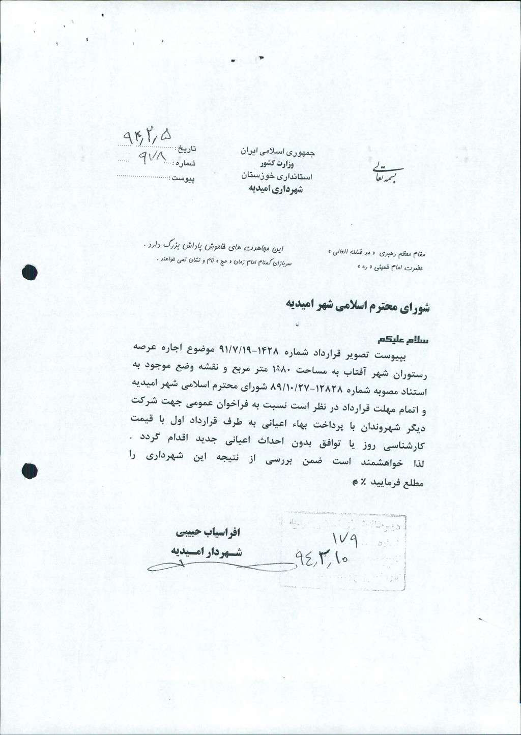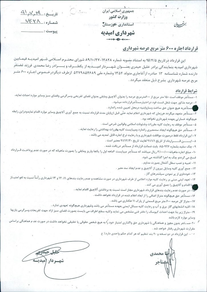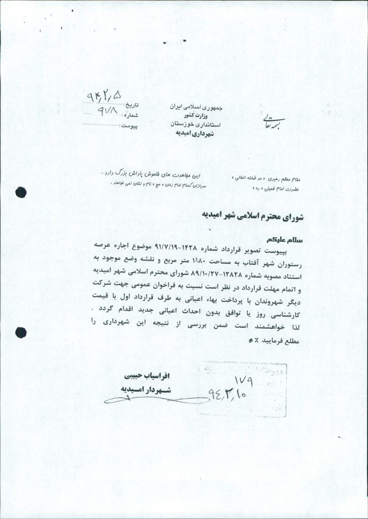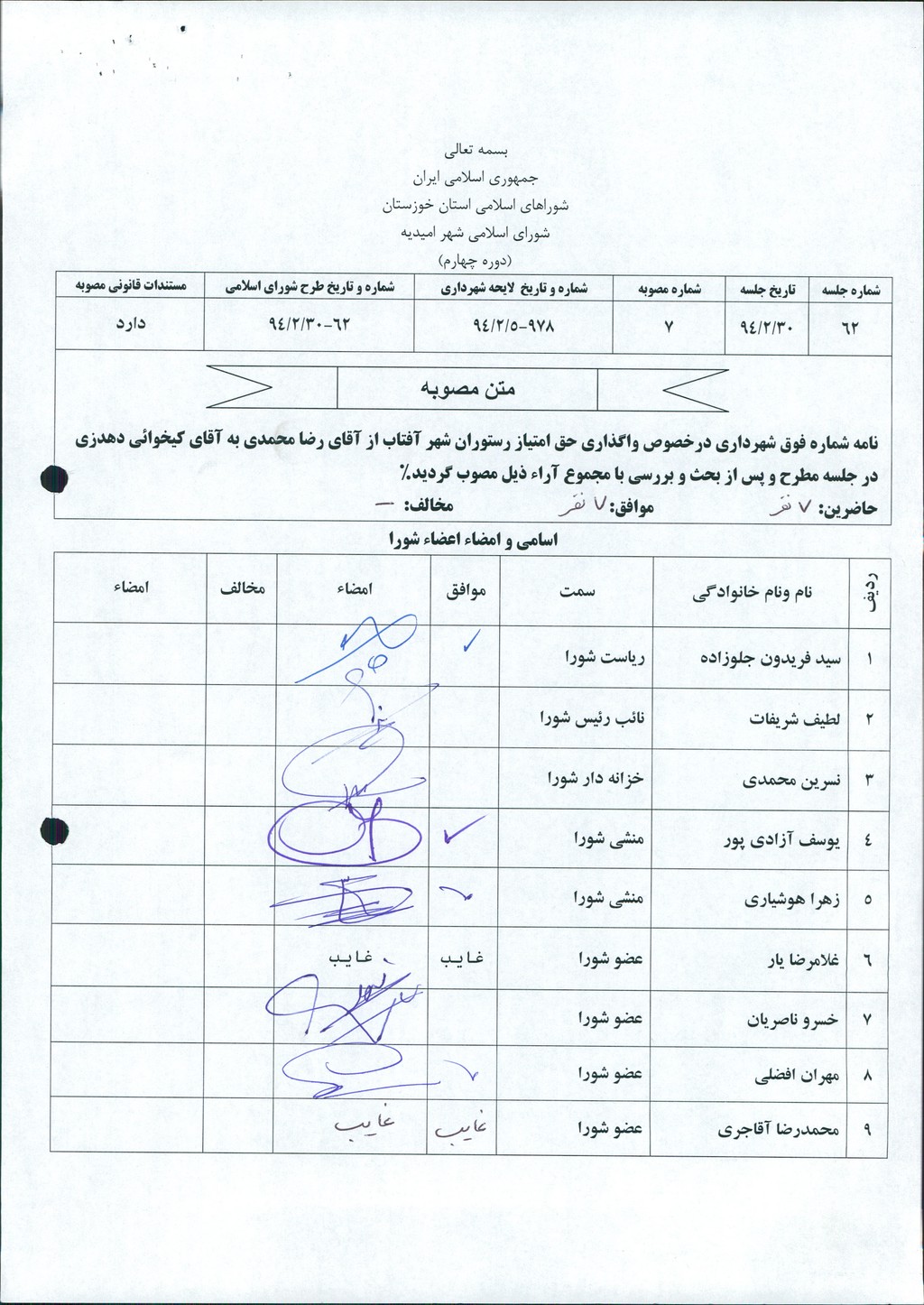 مصوبه شماره ۷ جلسه شماره ۶۲ مورخ ۹۴/۲/۳۰ شورای اسلامی شهر امیدیه