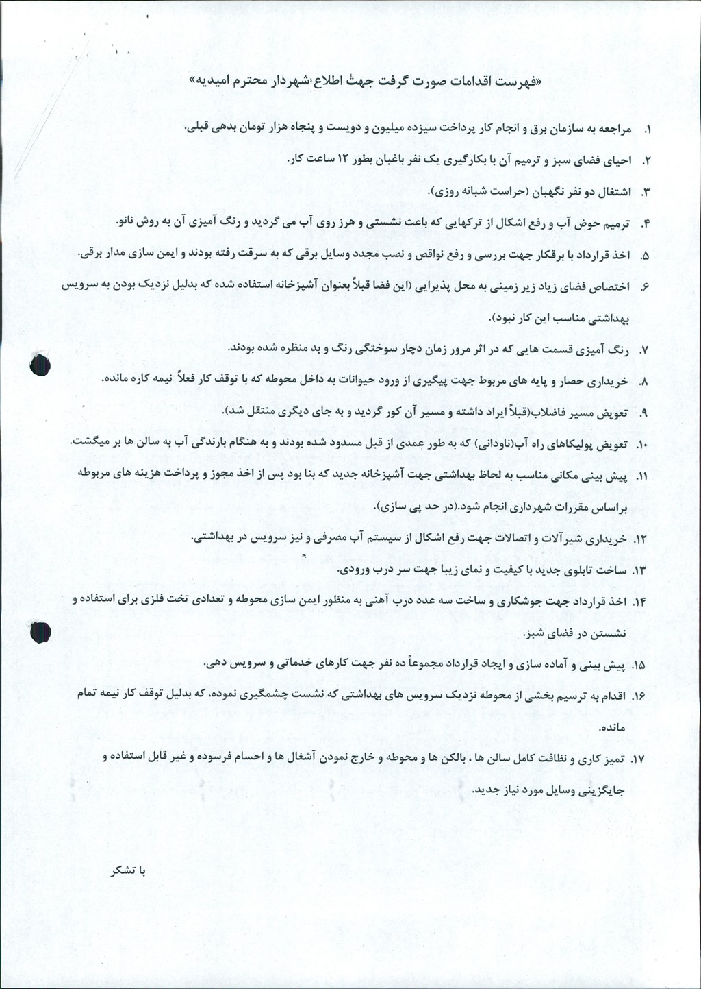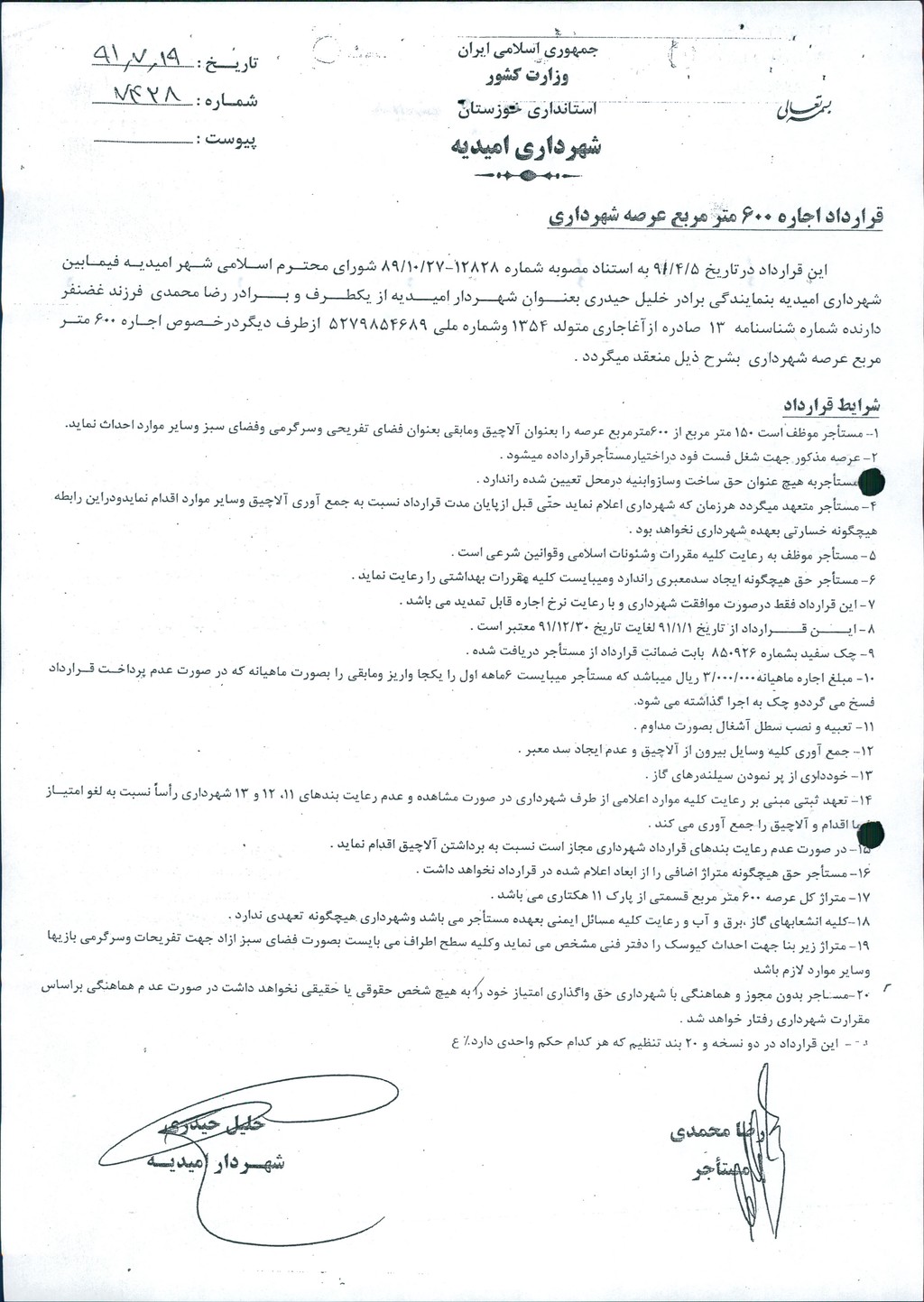 مصوبه شماره ۷ جلسه شماره ۷۰ شورای اسلامی شهر امیدیه