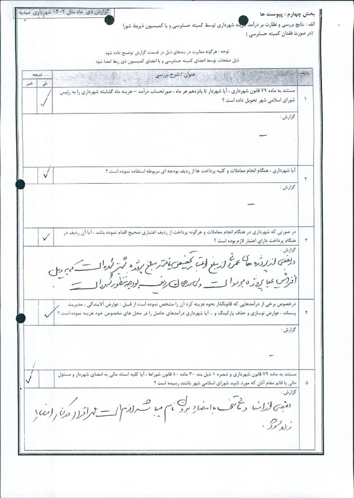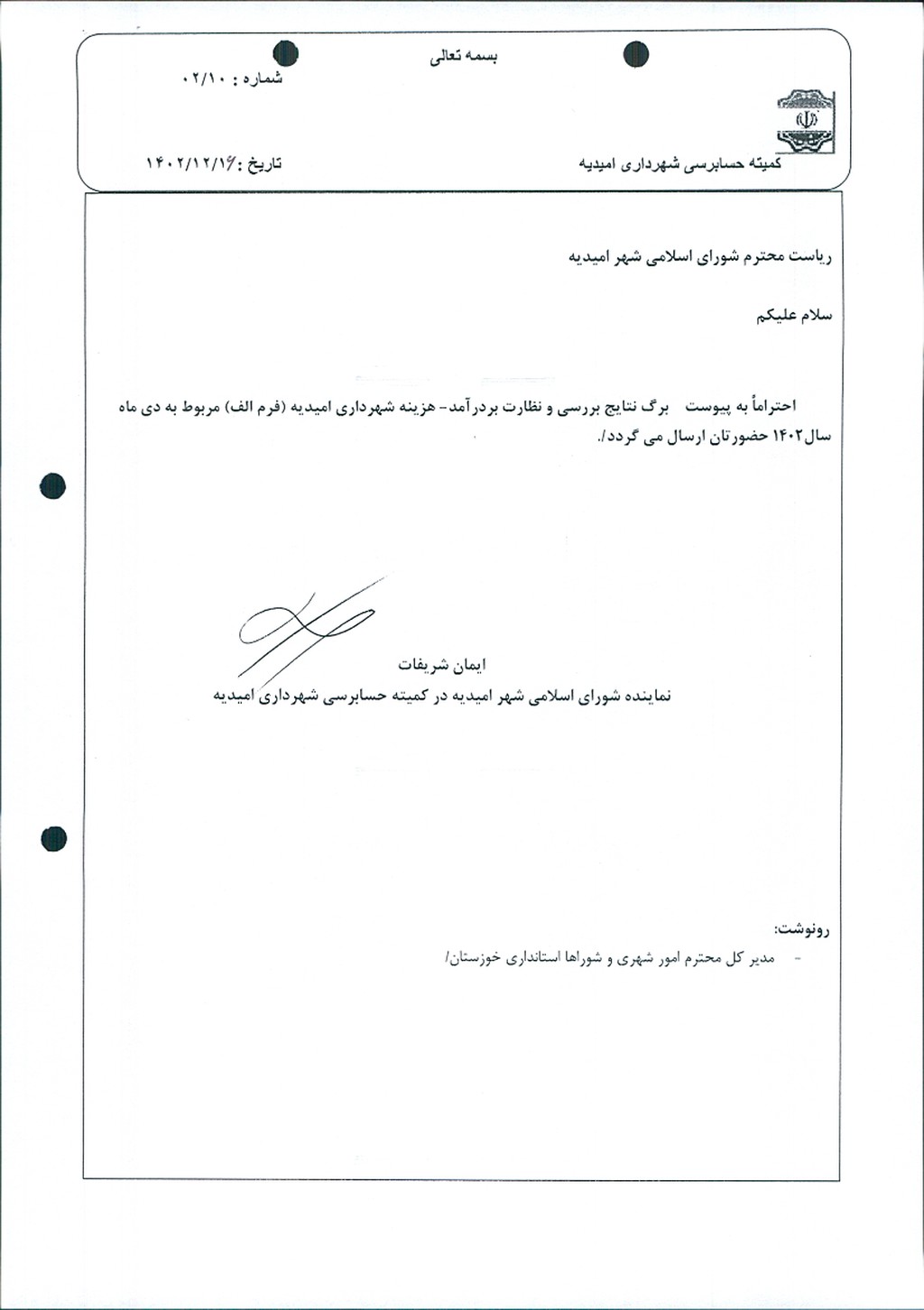 با توجه به ارائه گزارش عملکرد درآمد – هزینه دی ماه سالجاری شهرداری امیدیه توسط کمیته حسابرسی موضوع در جلسه مطرح و پس از بحث و بررسی با مجموع آراء ذیل مصوب گردید.