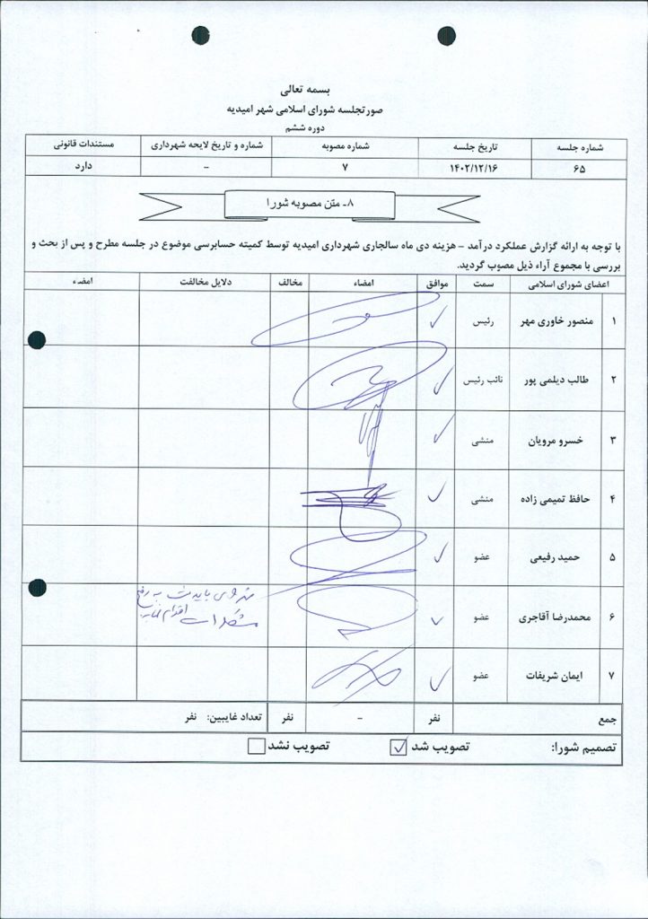 مصوبه شماره ۷ جلسه شماره ۶۵ شورای اسلامی شهر امیدیه