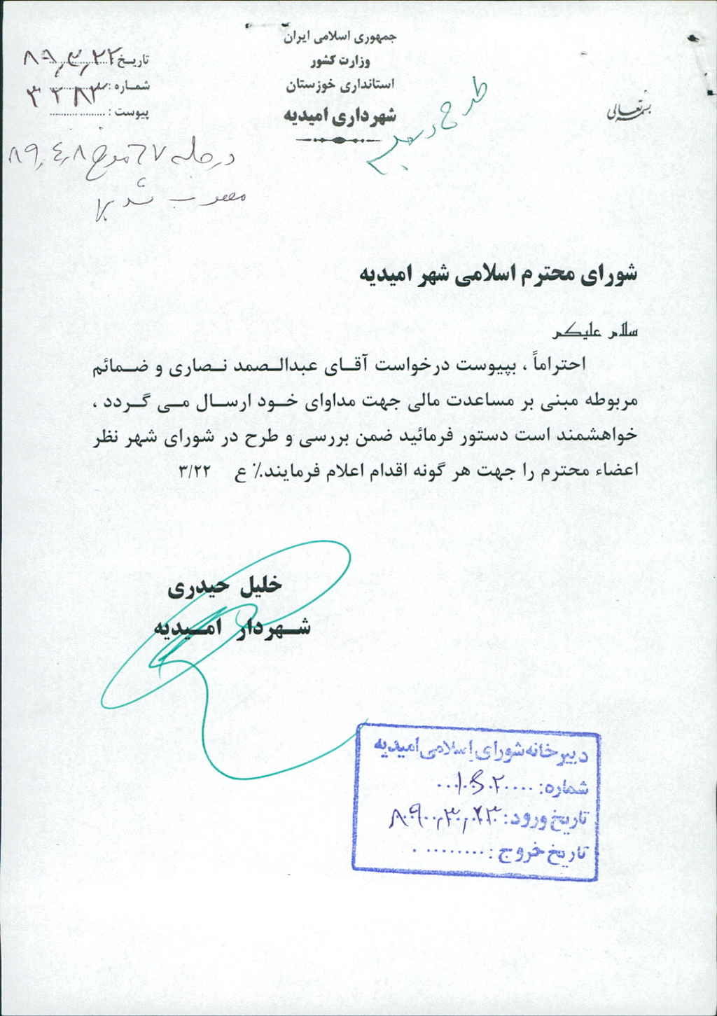 مصوبه شماره ۷ جلسه شماره ۶۷ مورخ ۸۹/۴/۸ شورای اسلامی شهر امیدیه