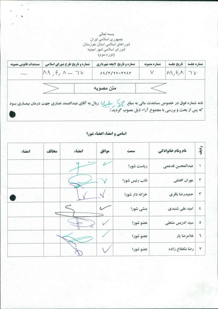 مصوبه شماره ۷ جلسه شماره ۶۷ شورای اسلامی شهر امیدیه