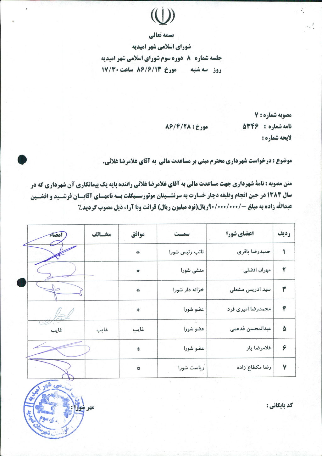 مصوبه شماره ۷ جلسه شماره ۸ مورخ ۸۶/۶/۱۳ شورای اسلامی شهر امیدیه