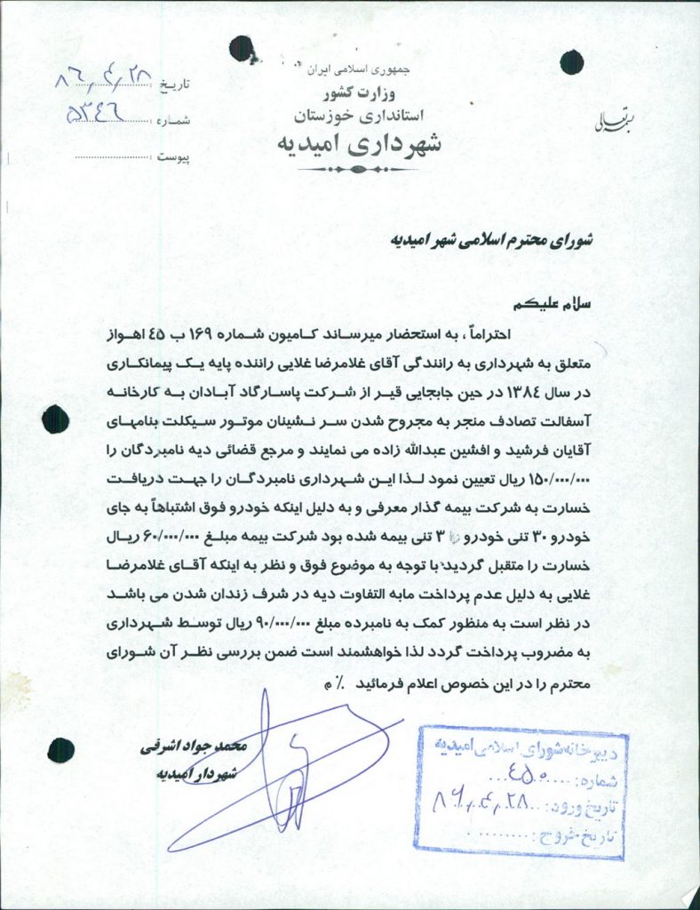 متن مصوبه : نامة شهرداري جهت مساعدت مالي به آقاي غلامرضا غلائي راننده پايه يك پيمانكاري آن شهرداري كه در سال ۱۳۸۴ در حين انجام وظيفه دچار خسارت به سرنشينان موتورسيكلت به نامهاي آقايان فرشيد و افشين عبدالله زاده به مبلغ ۹۰۰۰۰۰۰۰ ريال(نود ميليون ريال) قرائت وبا آراء ذيل مصوب گرديد.