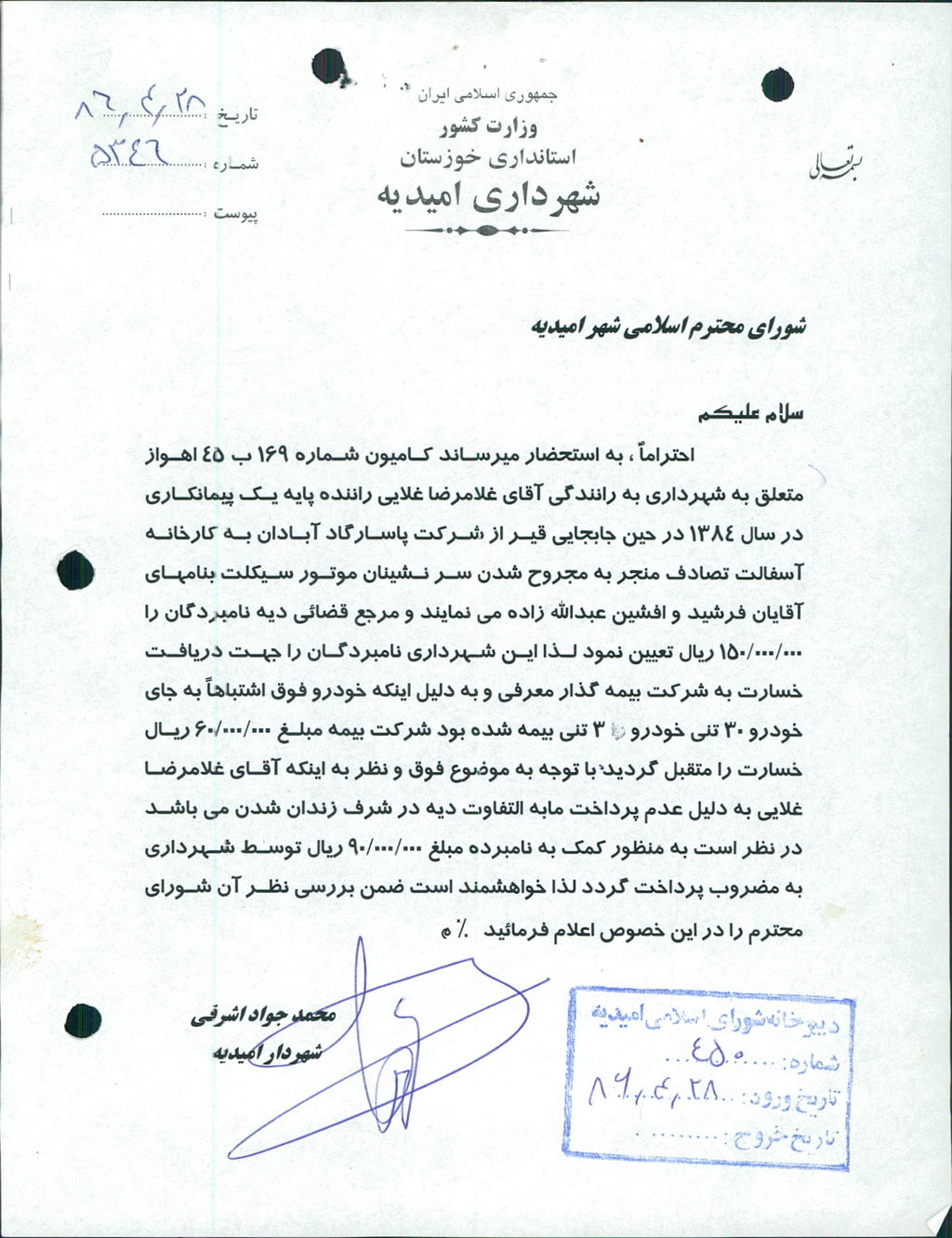 موضوع : درخواست شهرداري محترم مبني بر مساعدت مالي  به آقاي غلامرضا غلائي.
