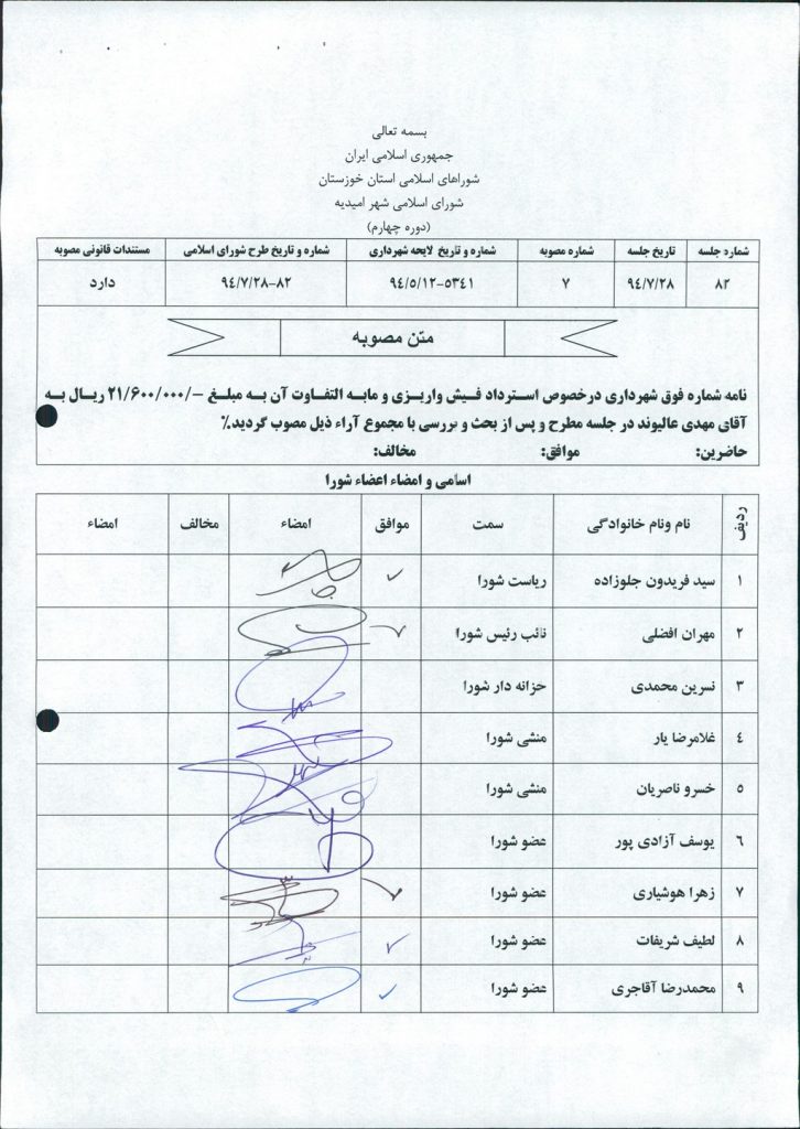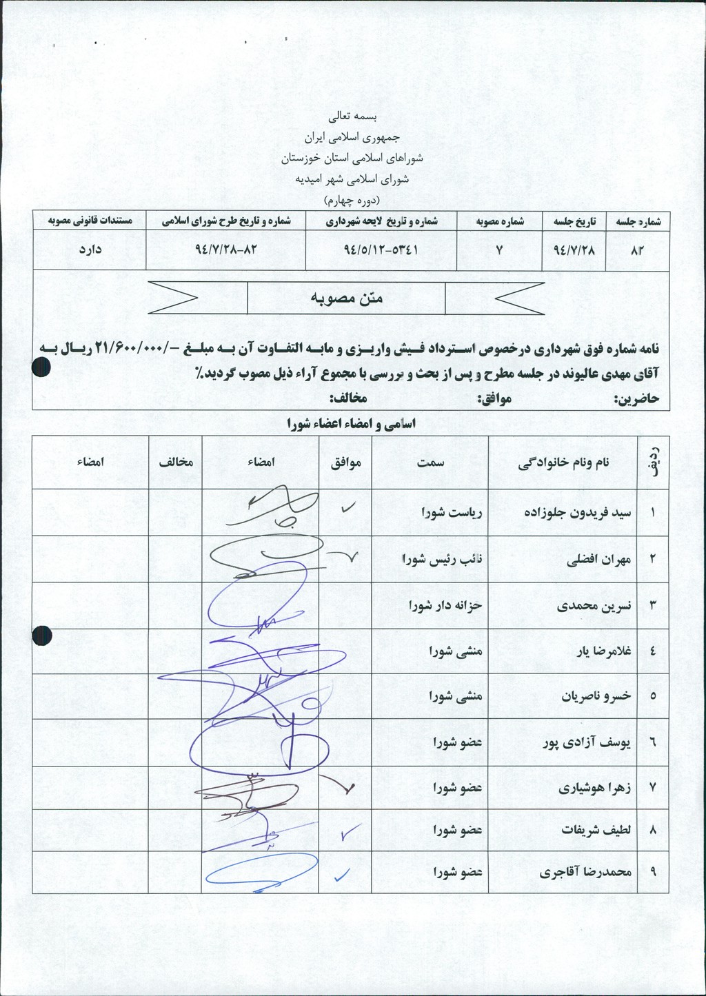 مصوبه شماره ۷ جلسه شماره ۸۲ مورخ ۹۴/۷/۲۸ شورای اسلامی شهر امیدیه