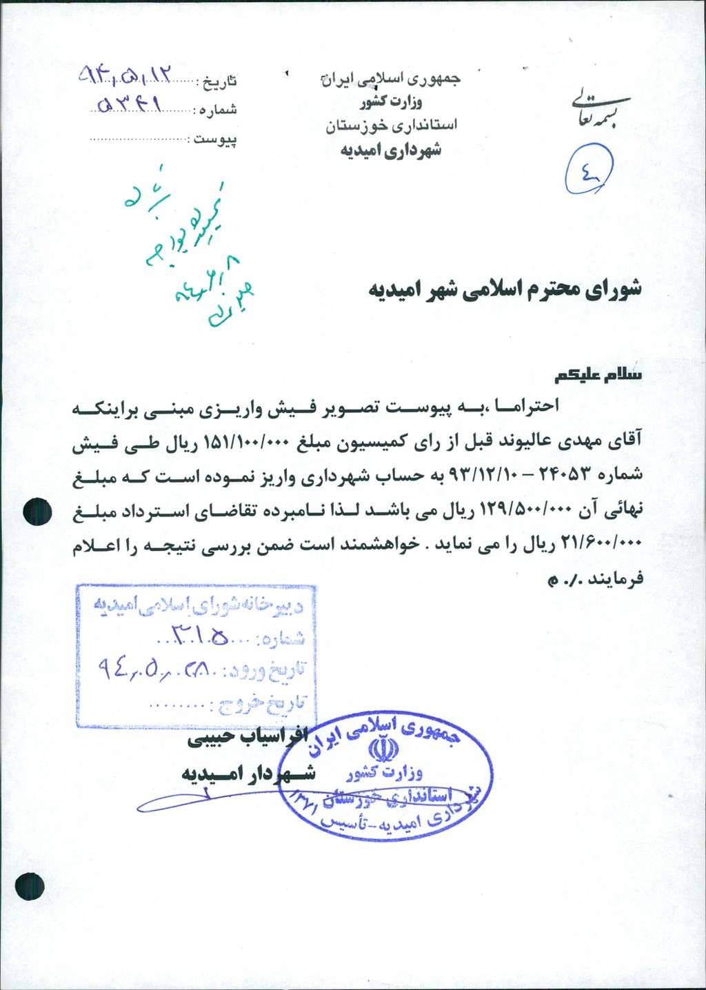 نامه شماره فوق شهرداری درخصوص استرداد فیش واریزی و مابه التفاوت آن به مبلغ ۲۱۶۰۰۰۰۰ریال به آقای مهدی عالیوند در جلسه مطرح و پس از بحث و بررسی با مجموع آراء ذیل مصوب گردید%