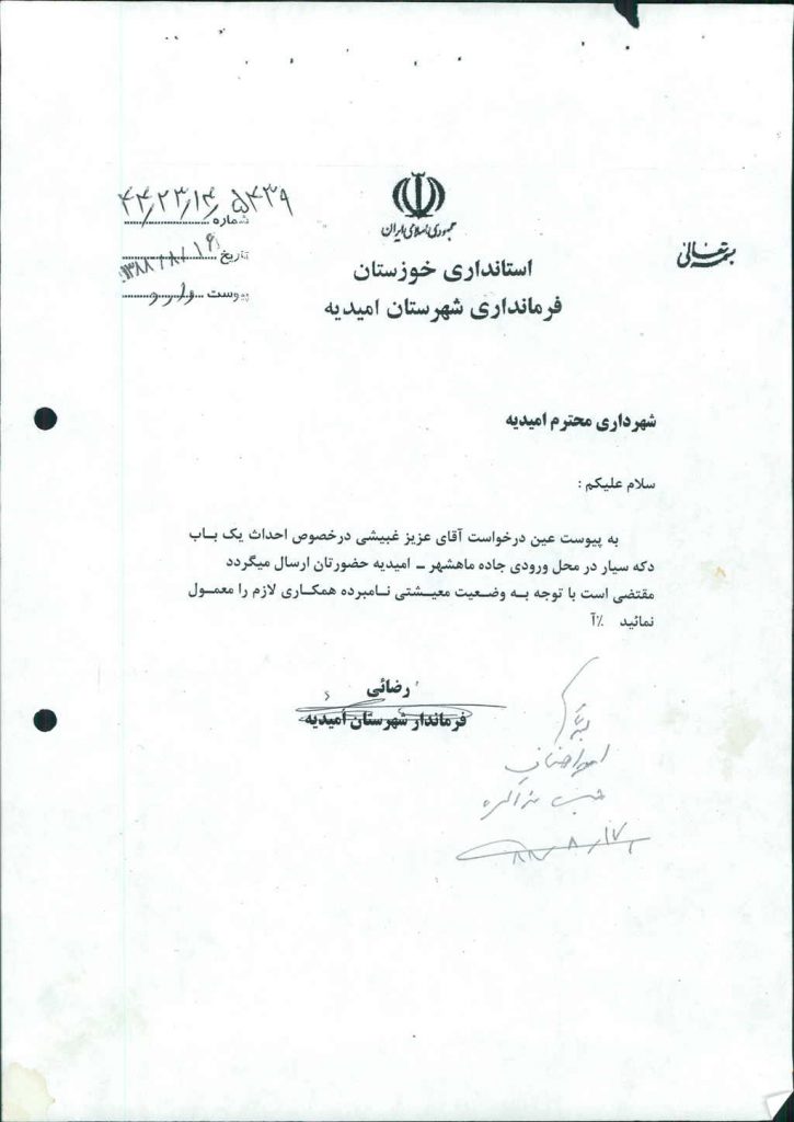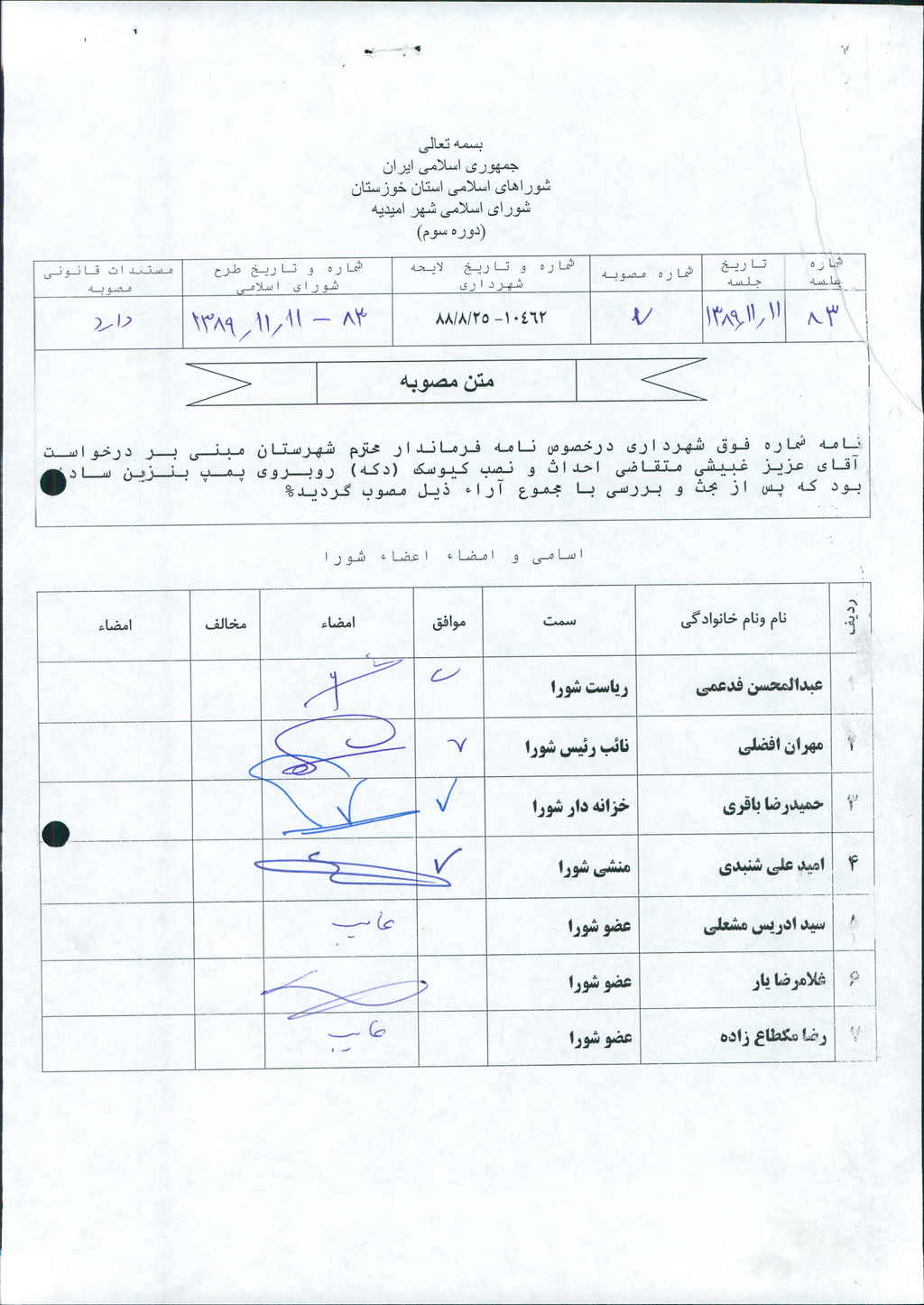 مصوبه شماره ۷ جلسه شماره ۸۳ شورای اسلامی شهر امیدیه
