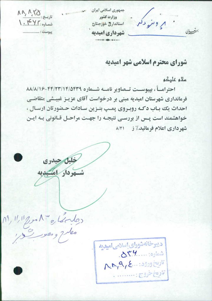 نامه شماره فوق شهرداری درخصوص نامه فرماندار محترم شهرستان مبنی بر درخواست آقای عزیز غبیشی متقاضی احداث و نصب کیوسک (دکه) روبروی پمپ بنزین سادات بود که پس از بحث و بررسی با مجموع آراء ذیل مصوب گردید%
