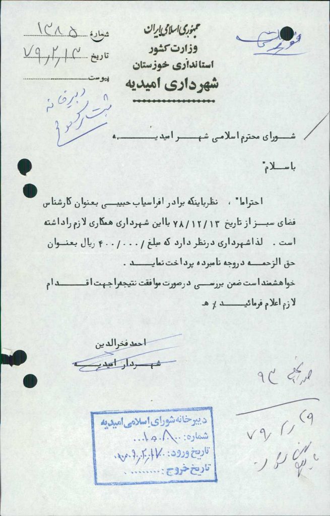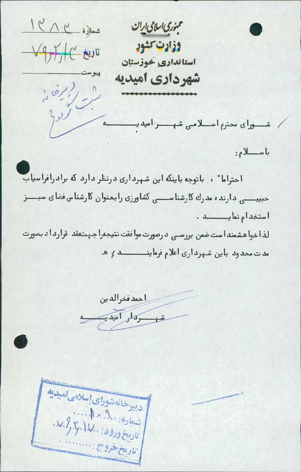 ۷-نامه هاي شماره ۱۳۸۳ مورخ ۱۳/ ۱۲/ ۷۹و ۱۳۸۵مورخ ۱۳/ ۲/ ۷۹در رابطه با آقاي افراسياب حبيبي كارشناس فضاي سبز مطرح و موافقت گرديد نامبرده طبق ضوابط و تابع قانون كار جذب و با پرداخت مبلغ -/۰۰۰/ ۴۰۰ ريال بعنوان حق الزحمه نامبرده طبق تاريخ ۱۳/ ۱۲/ ۷۸با تعداد ۷ رأي موافقت گرديد.
