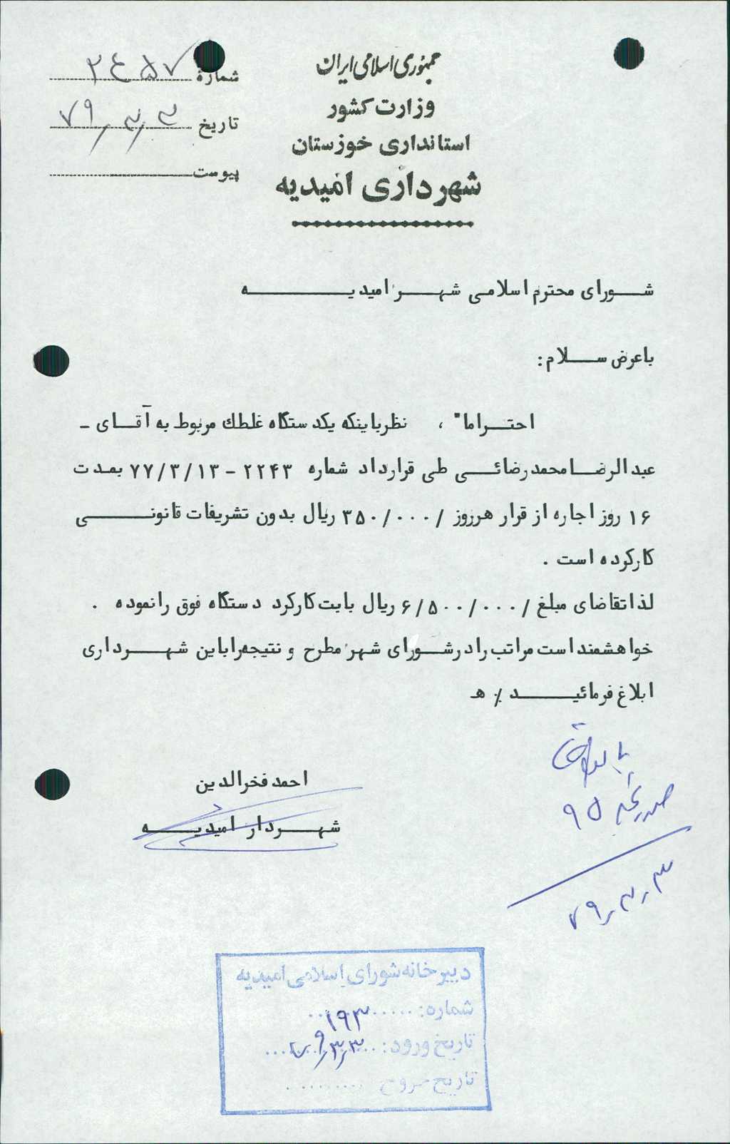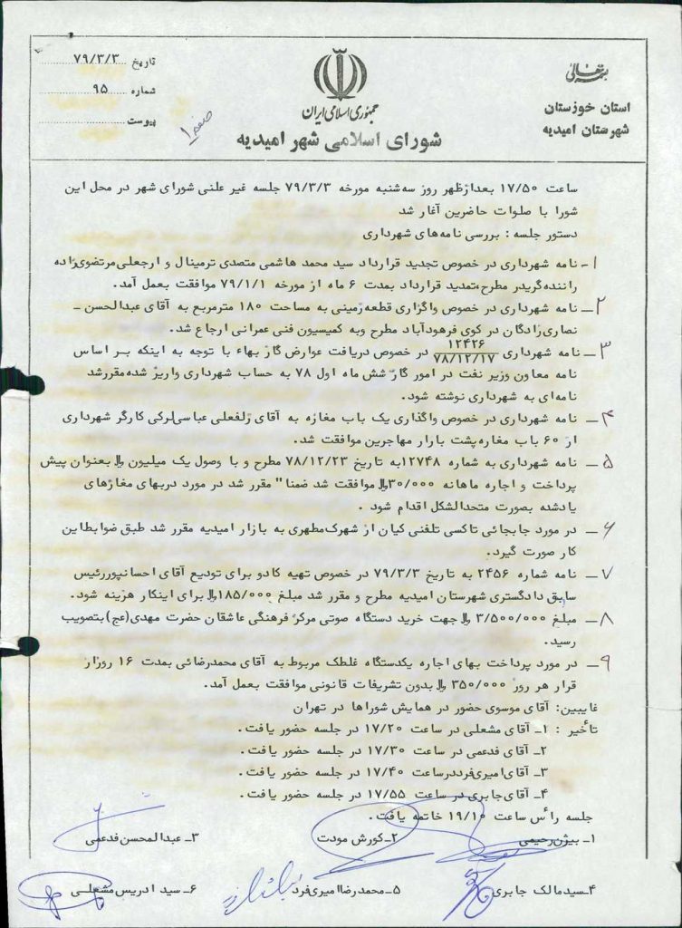 مصوبه شماره ۷ جلسه شماره ۹۵ مورخ ۷۹/۳/۳ شورای اسلامی شهر امیدیه