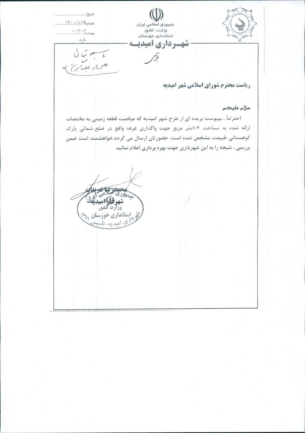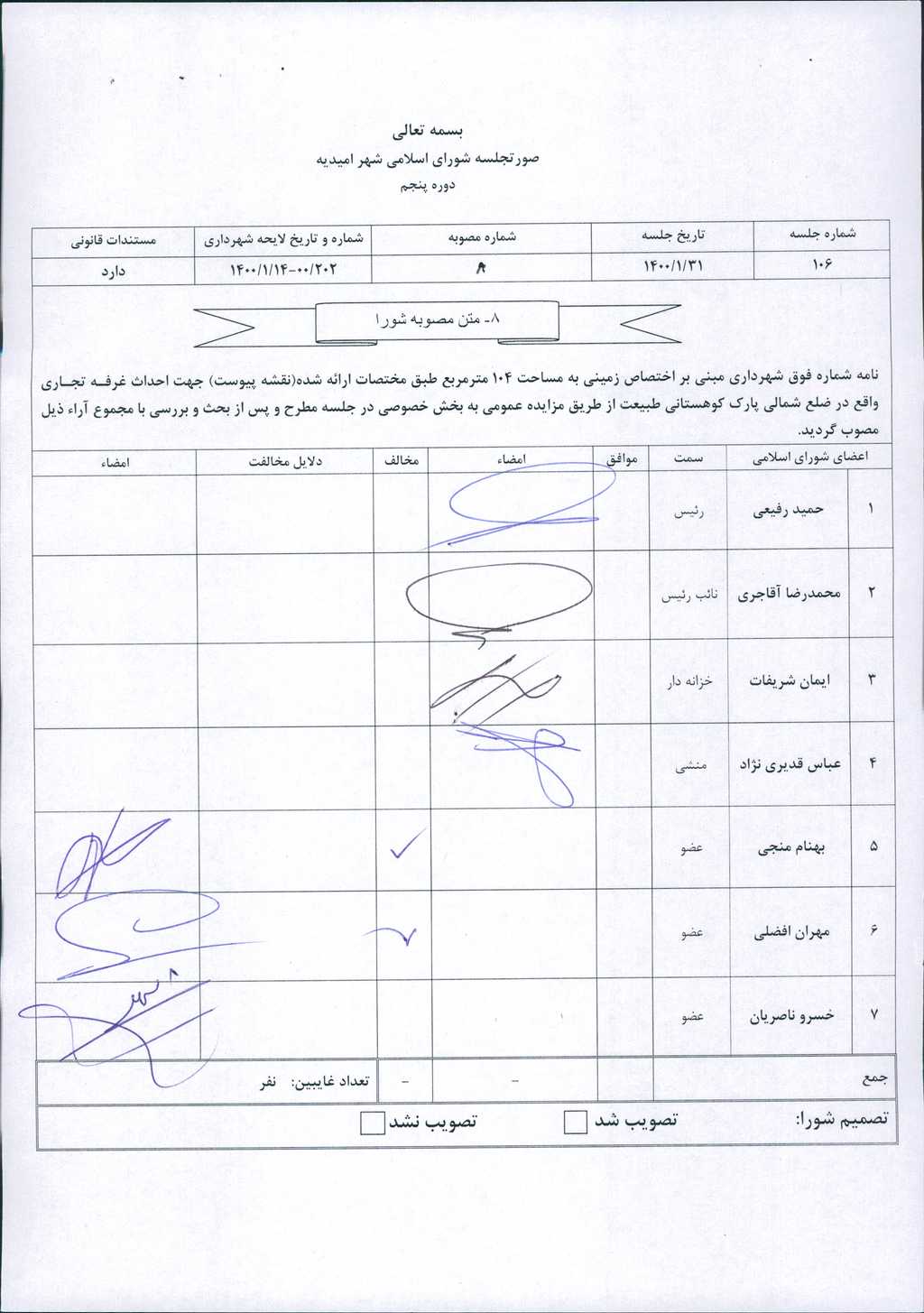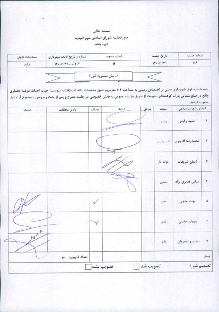 مصوبه شماره ۸ جلسه شماره ۱۰۶ مورخ ۱۴۰۰/۱/۳۱ شورای اسلامی شهر امیدیه