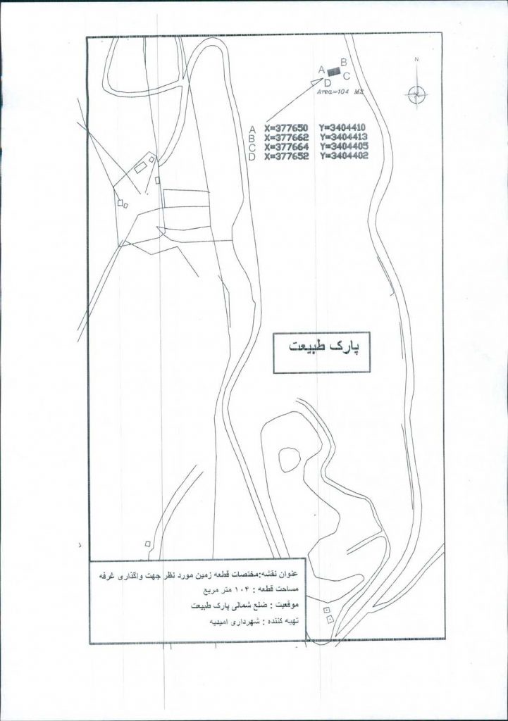 نامه شماره فوق شهرداری مبنی بر اختصاص زمینی به مساحت ۱۰۴ مترمربع طبق مختصات ارائه شده(نقشه پیوست) جهت احداث غرفه تجاری واقع در ضلع شمالی پارک کوهستانی طبیعت از طریق مزایده عمومی به بخش خصوصی در جلسه مطرح و پس از بحث و بررسی با مجموع آراء ذیل مصوب گردید.