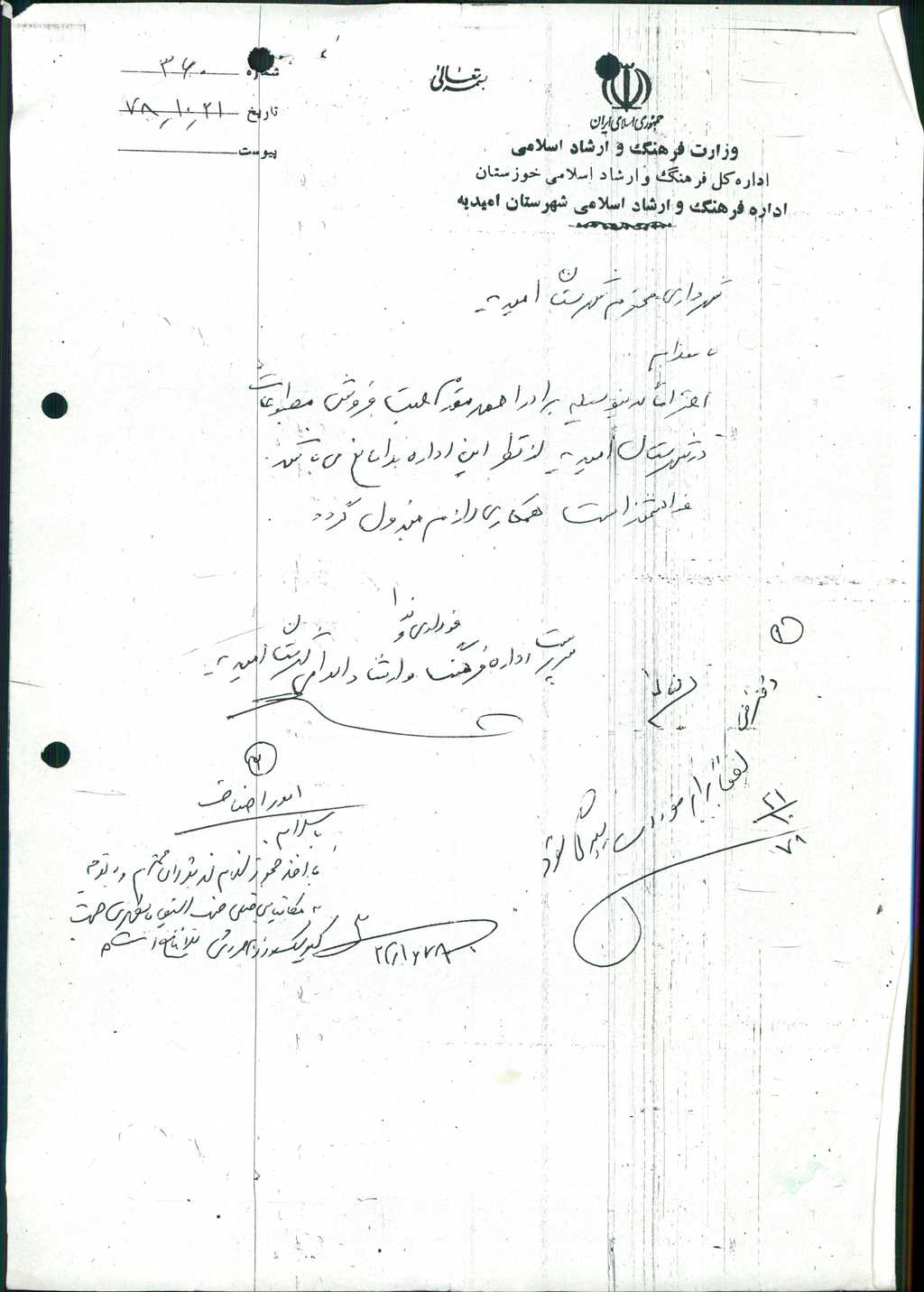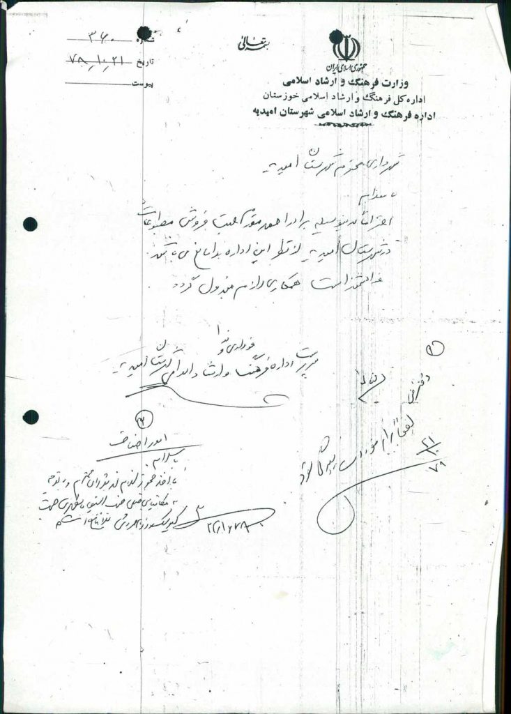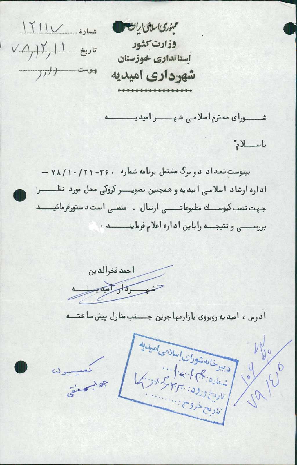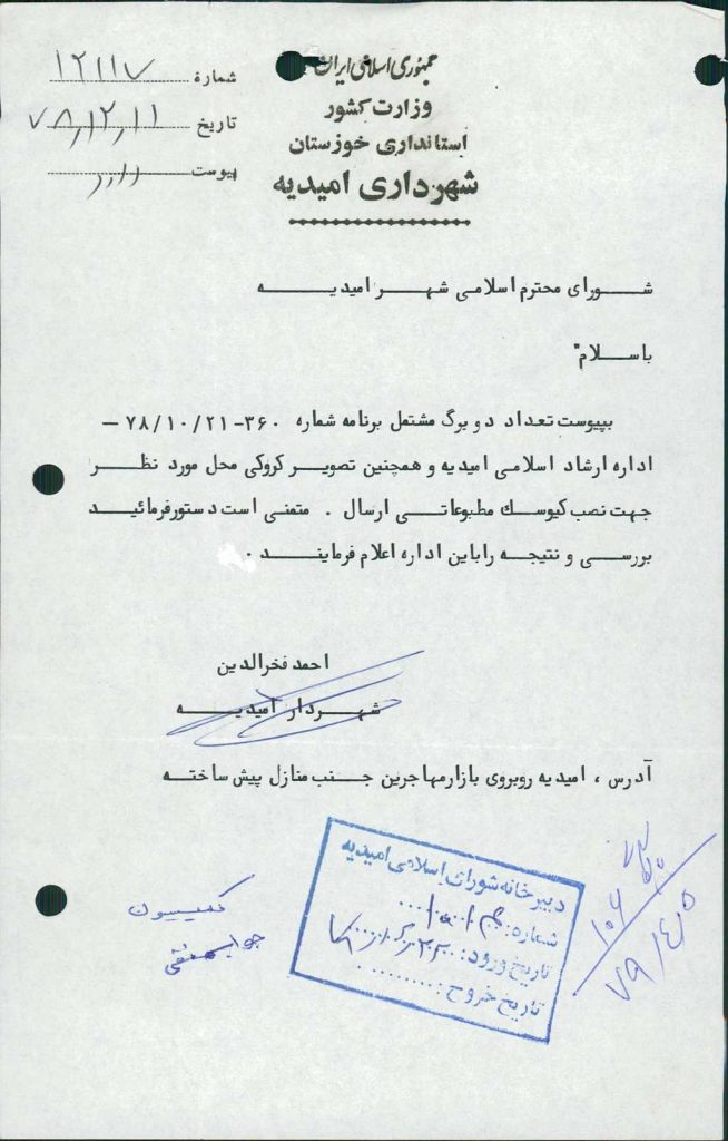 ۸-نامه شماره ۱۲۱۱۷مورخ ۱۱/ ۱۲/ ۷۸شهرداري در خصوص كروكي محل نصب كيوسك مطبوعاتي درخواستي اداره ارشاد اسلامي مطرح و با توجه به اينكه در محدوده منازل سازماني شركت نفت مي باشد و با ۵ رأي مخالف رد شد.