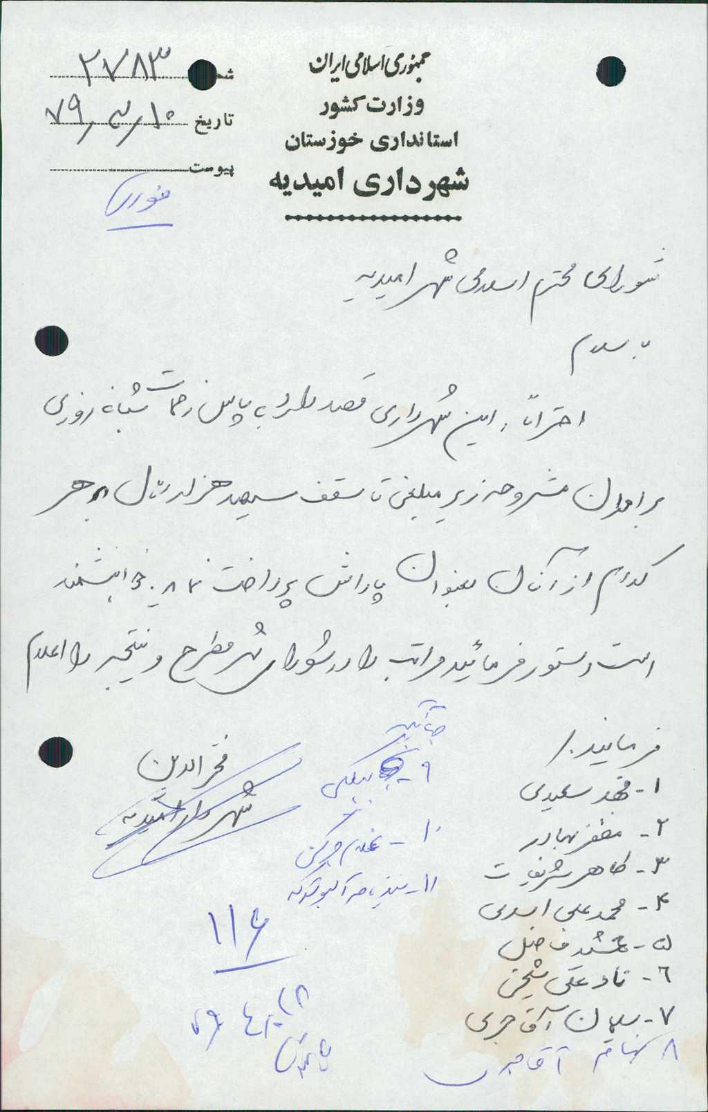 ۸-نامه شماره ۲۷۸۳ مورخ ۱۰/ ۳/ ۷۹ در رابطه با پاداش به پاس زحمات شبانه روزي برادران فهد سعيدي ، مظفر بهادر ، طاهر شريفات ، محمد علي اسدي، جمشيد فاضل، نادعلي شيخي، سليمان آقاجري، بهنام آقاجري ، جهانگير بيلكي غلامحسين جركني ، سيد ناصر آلبوشوكه و ارجعلي مرتضوي زاده مبلغ-/۰۰۰/ ۳۰۰ ريال پرداخت نمايد مطرح و با تعداد ۷ رأي موافق به تصويب رسيد.