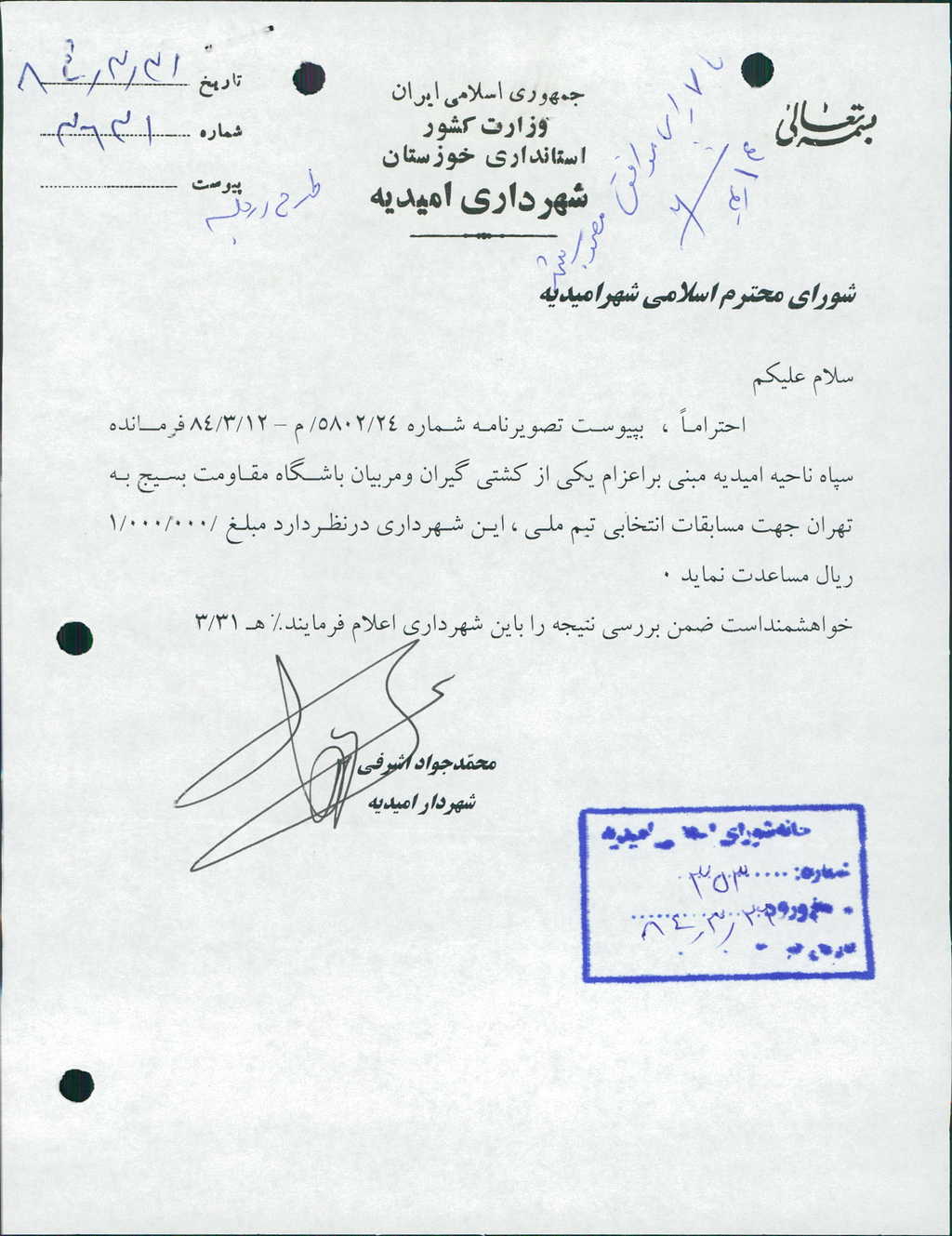 بسم الله الرحمن الرحیم مصوبه شماره ۸ جلسه شماره ۱۱۷ شورای اسلامی شهر امیدیه