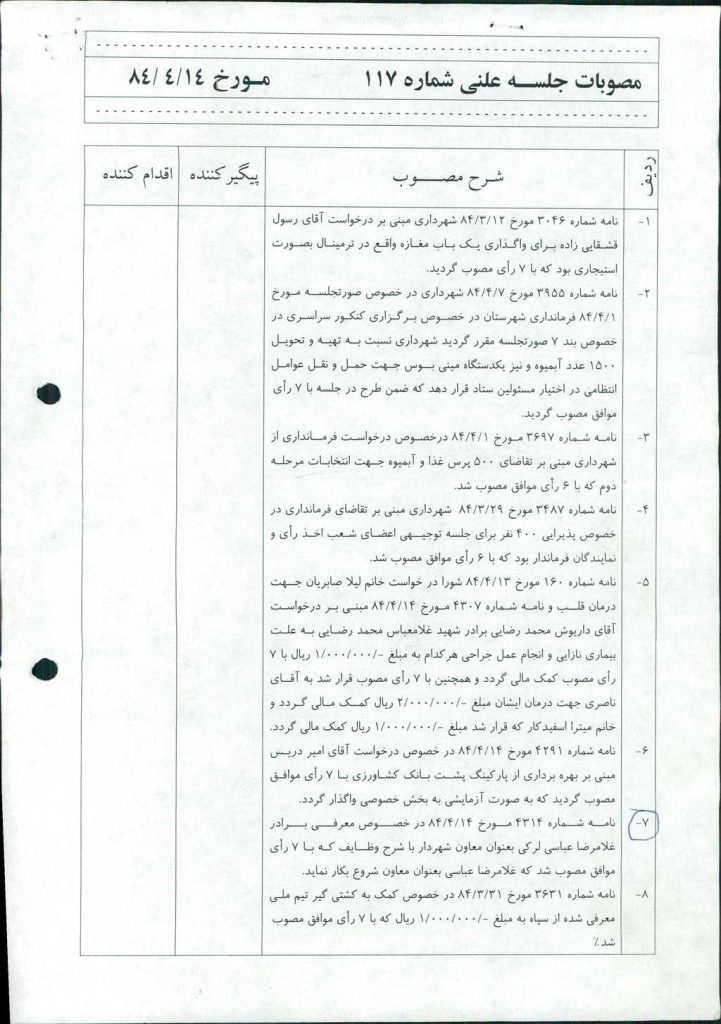 ۸-نامه شماره ۳۶۳۱ مورخ ۳۱/ ۳/ ۸۴ در خصوص كمك به كشتي گير تيم ملي معرفي شده از سپاه به مبلغ -/۰۰۰/۰۰۰/ ۱ ريال كه با ۷ رأي موافق مصوب شد%