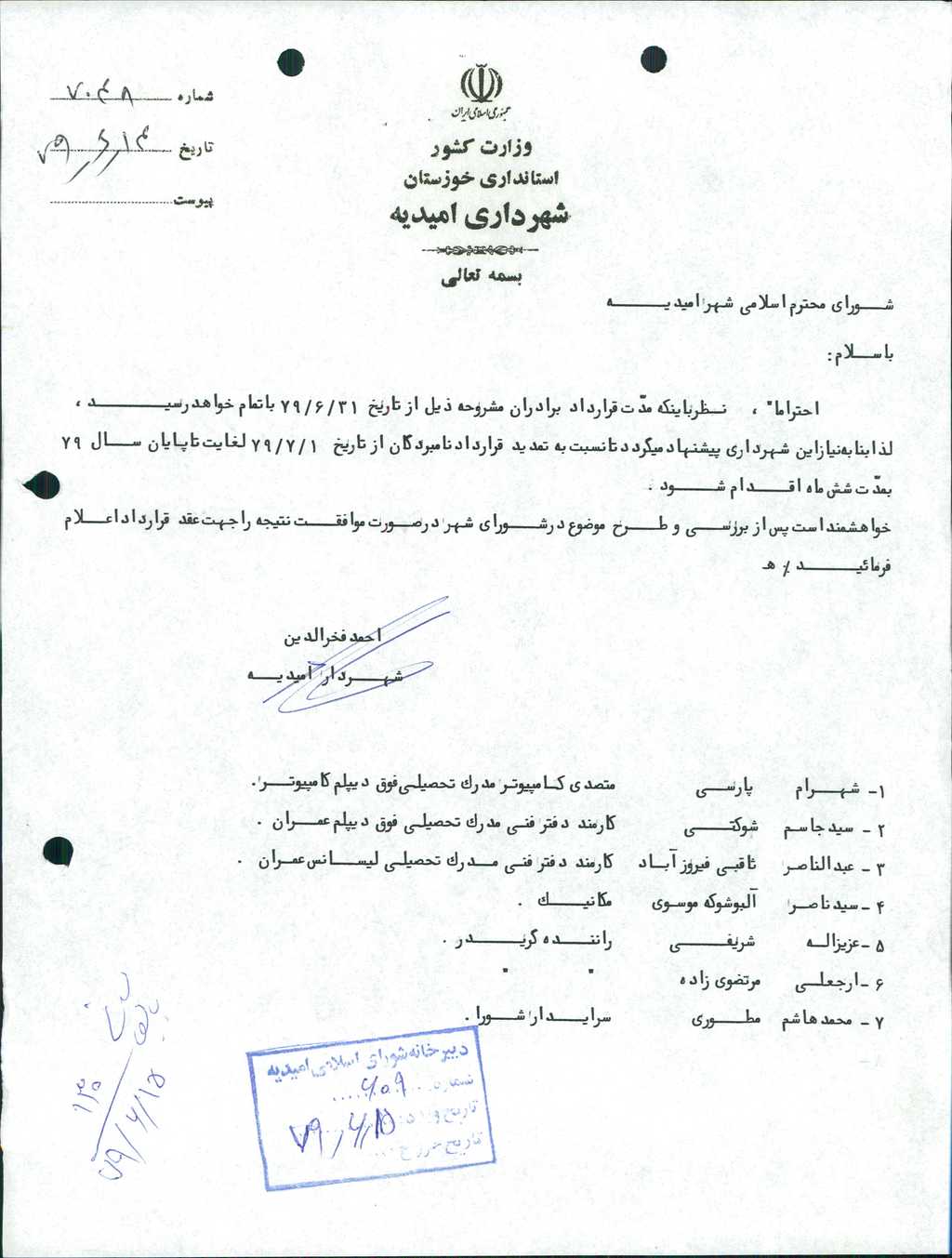 ۸-نامه شماره ۷۰۴۸مورخه ۱۴/ ۶/ ۷۹ در خصوص تمديد قرارداد نامبردگان ذيل از تاريخ ۱/ ۷/ ۷۹ لغايت پايان سال ۷۹ بمدت شش ماه مطرح و با توجه به نياز شهرداري به تخصص نامبردگان يادشده با ۵ رأي موافق به تصويب رسيد.